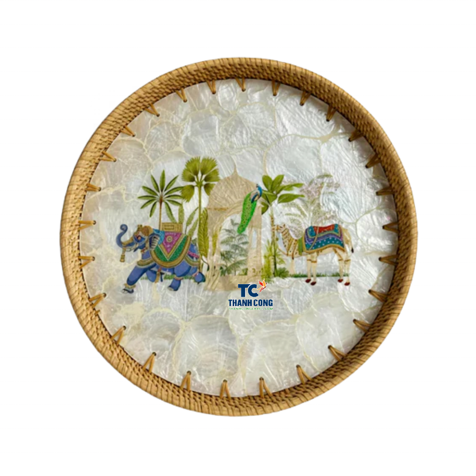 Plateau en nacre et rotin, fabrication artisanale, élégant, vaisselle faite à la main, plateau en nacre fait main, Vietnam