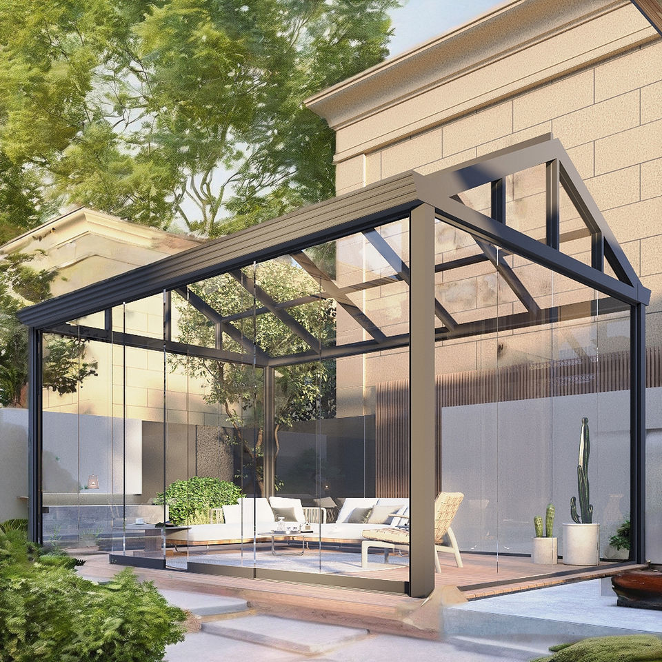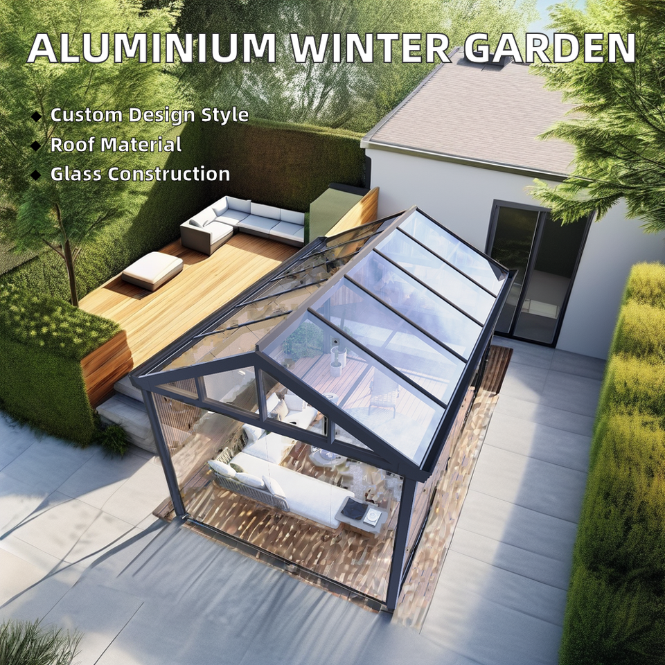 Usine professionnelle petit cadre en aluminium parasols serre à Double vitrage avec moulage de toit en triangle matériau en verre trempé