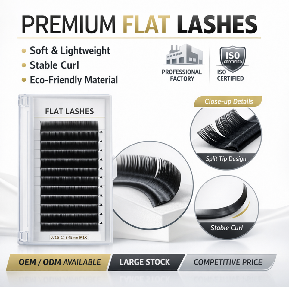 Extensions de cils professionnelles plates en forme d'ellipse, noir mat foncé, faux vison doux, pointes fendues, cils individuels faits à la main, logo personnalisé
