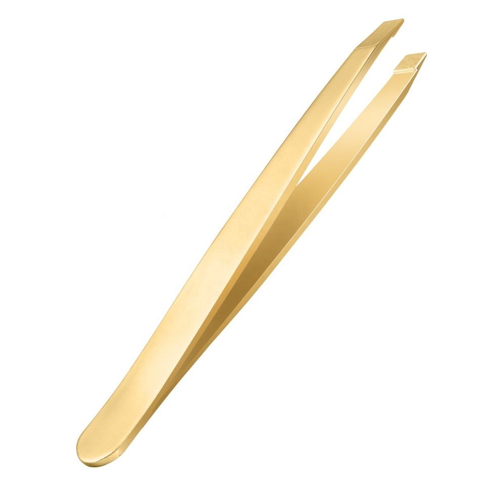 Pince à épiler professionnelle dorée pour sourcils, à pointe inclinée, revêtement plasma, haute qualité, avec miroir pour cils et outil de façonnage pour usage esthétique