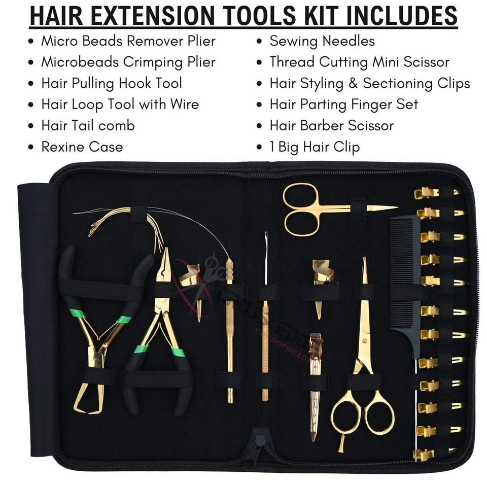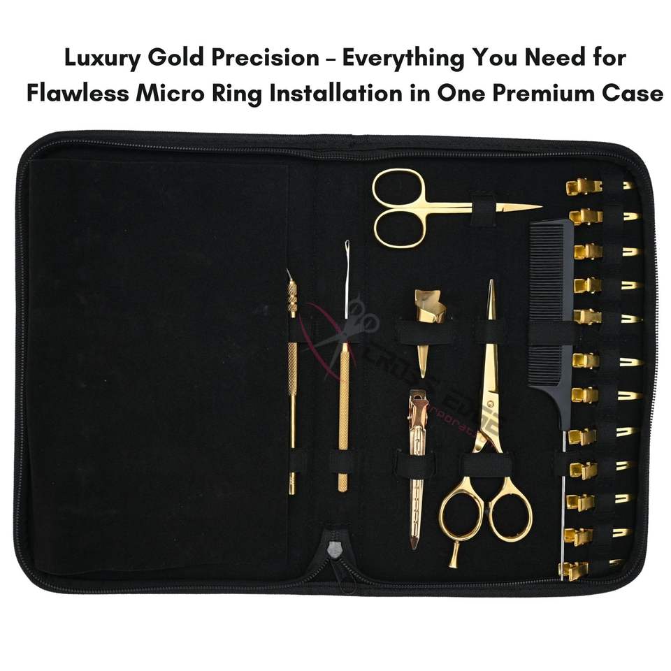 Kit d'outils professionnels pour extensions de cheveux dorées : Enfileur de micro-anneaux, Pince à sertir les micro-perles, Pince à ouvrir et retirer les perles, Ciseaux