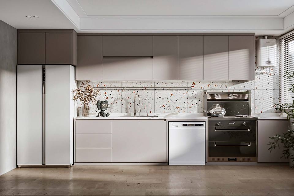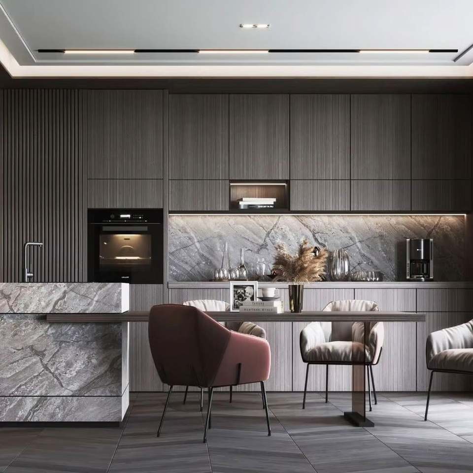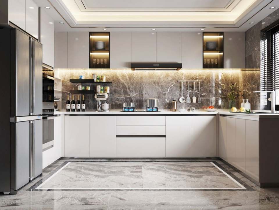 Armoires de cuisine de qualité professionnelle avec évier en acier et plan de travail en marbre, conception gratuite