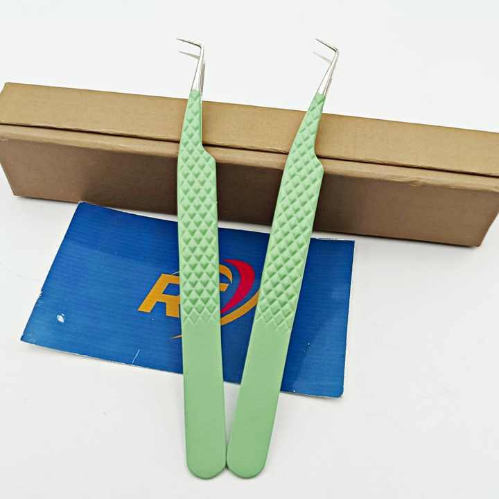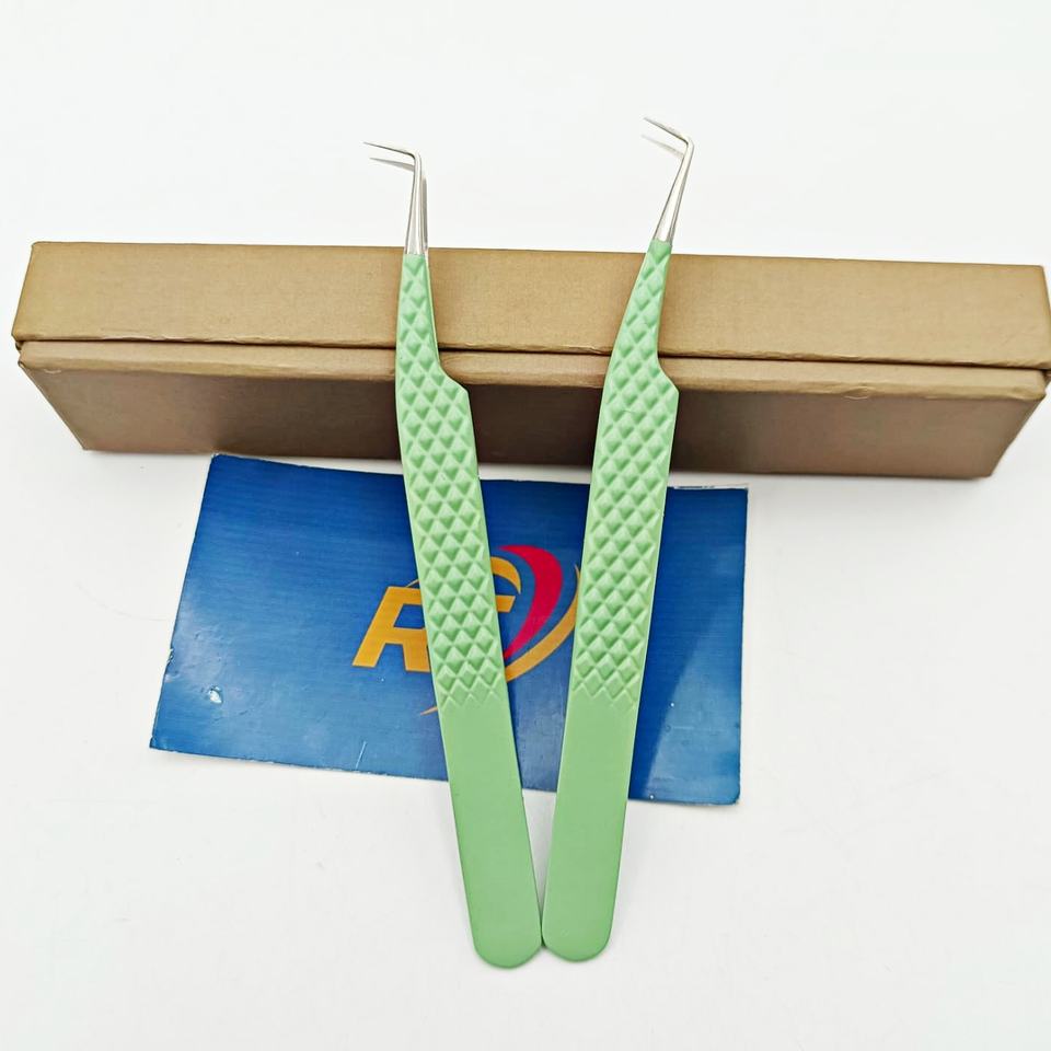 Pince à épiler professionnelle verte mate avec poignée diamantée à 90 degrés pour la création de fans parfaits, maintien ferme des cils, et boîte.