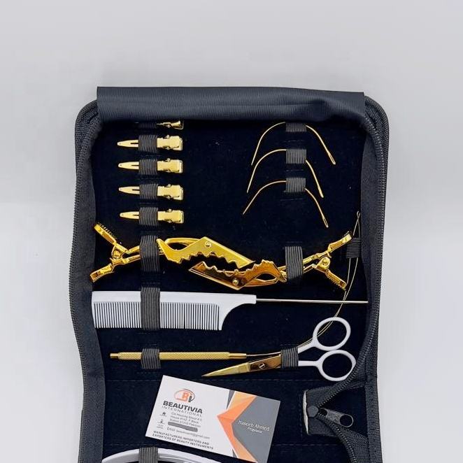 Kit d'outils professionnels pour extensions de cheveux, pinces alligator dorées, peigne blanc, aiguilles en C, logo personnalisé en acier inoxydable