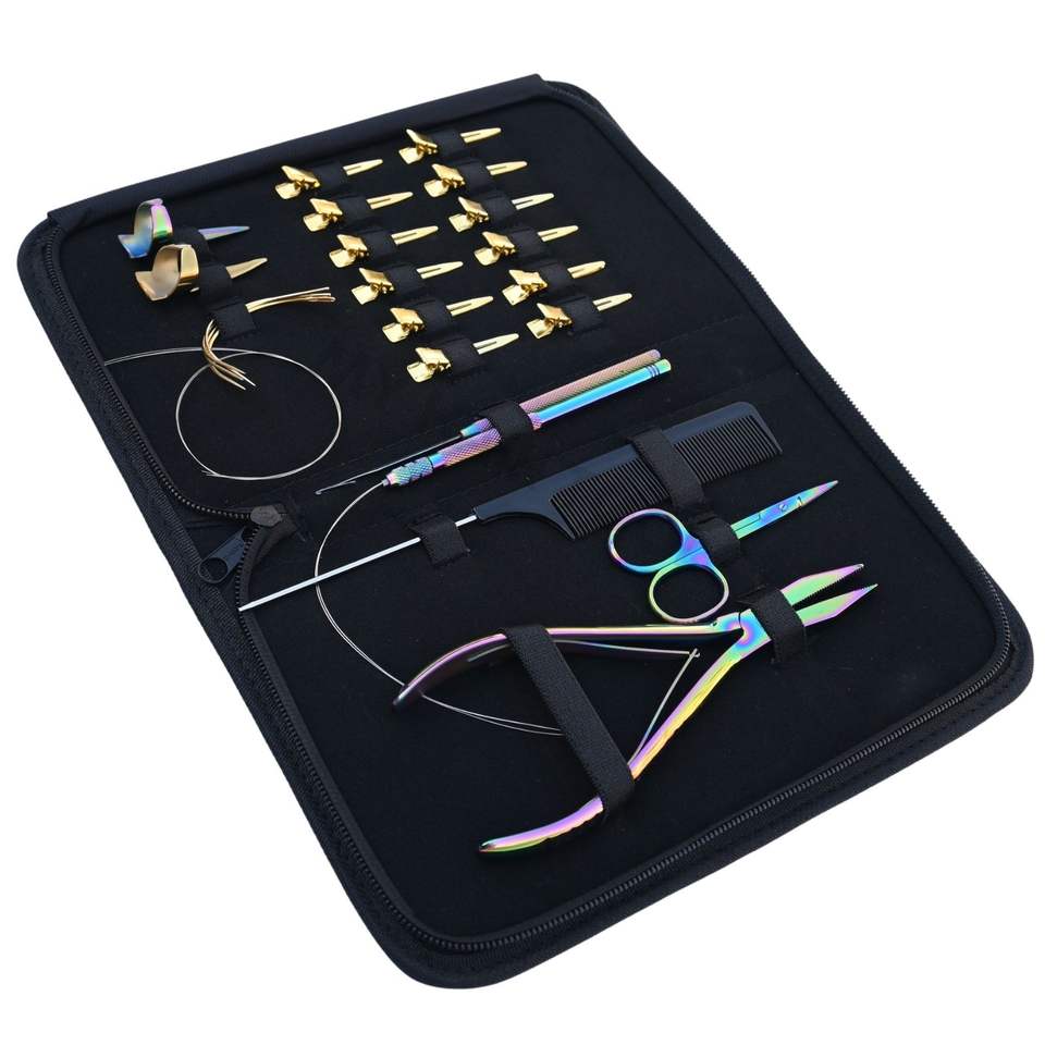 Kit d'outils professionnels pour extensions capillaires avec pince à micro-anneaux plate, outil de tirage, peigne à queue et aiguilles courbées pour usage en salon