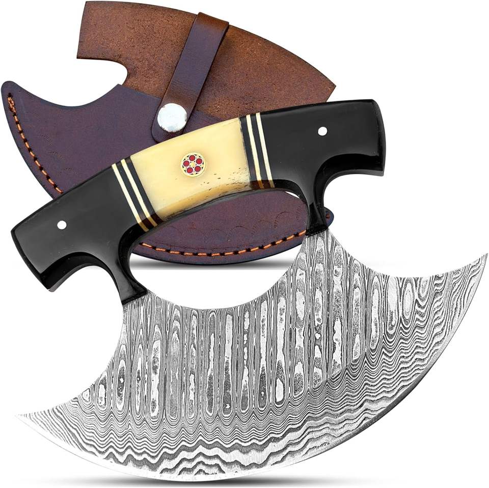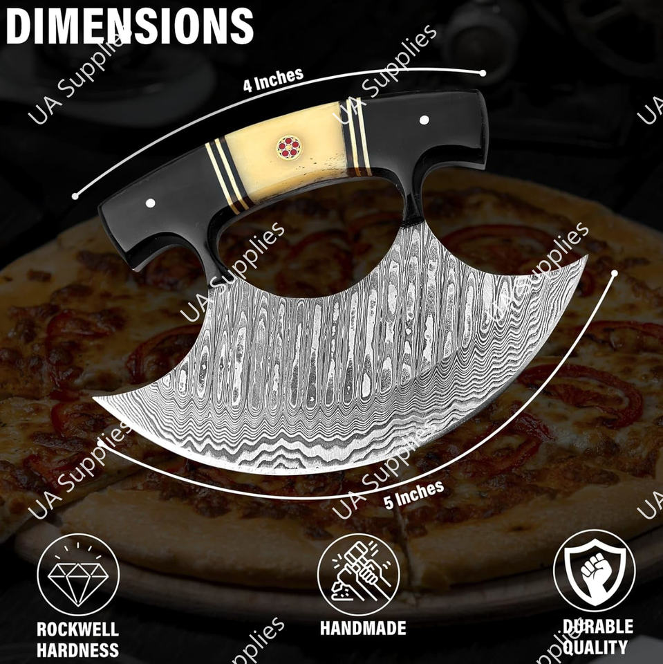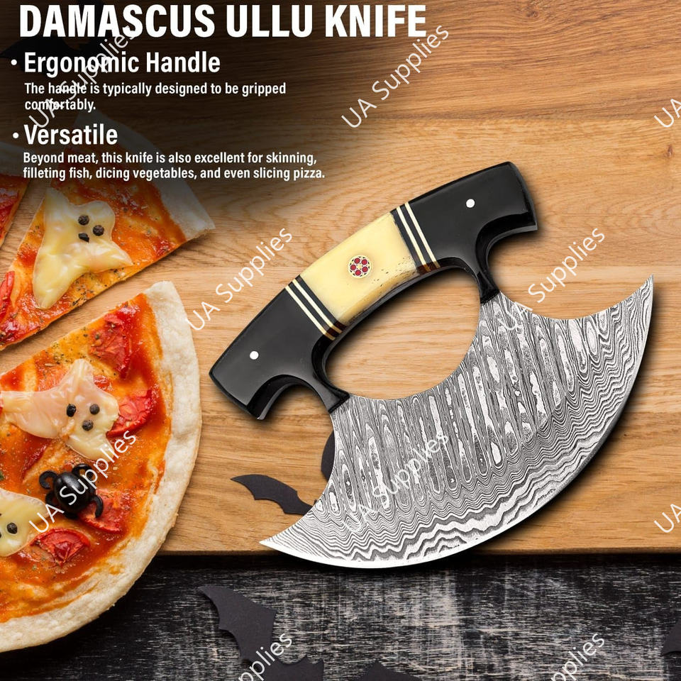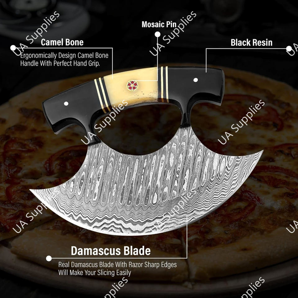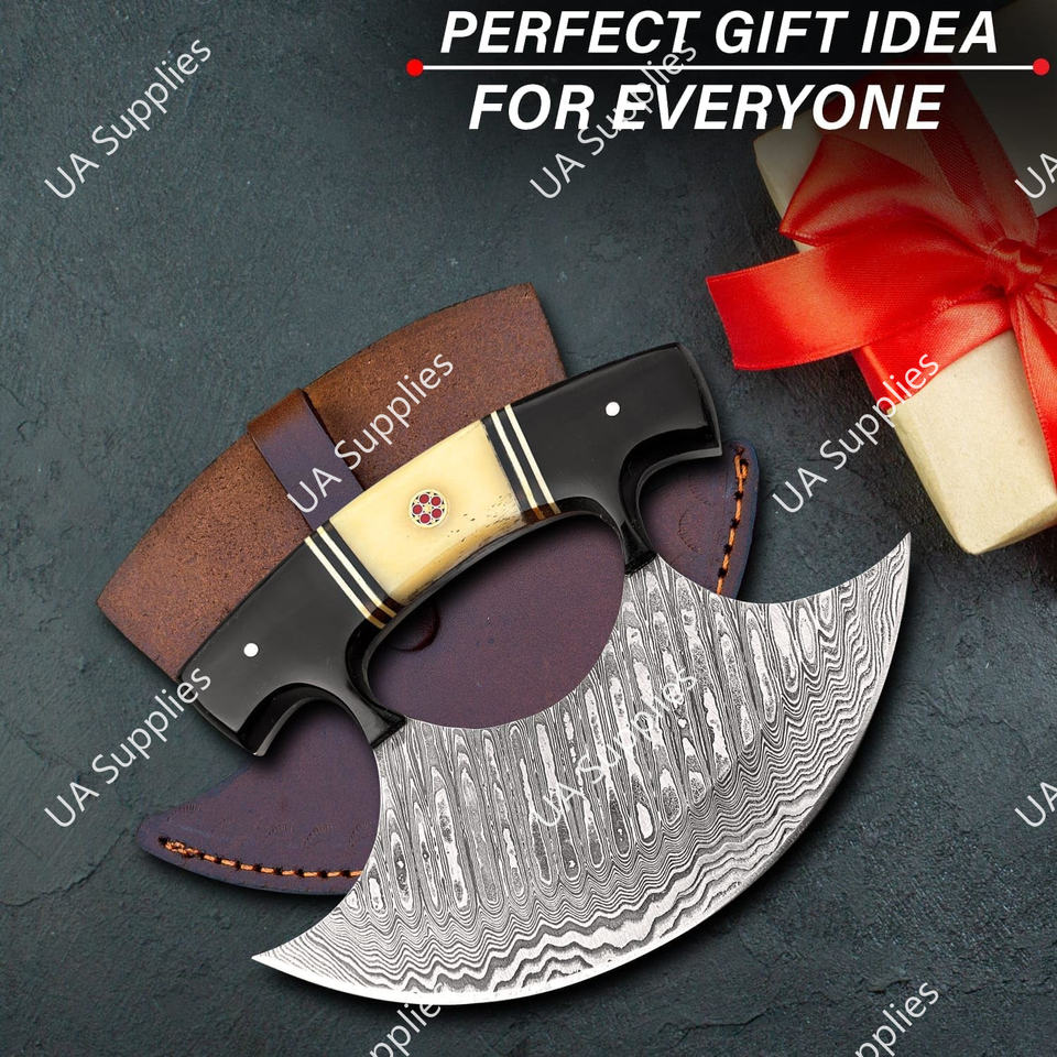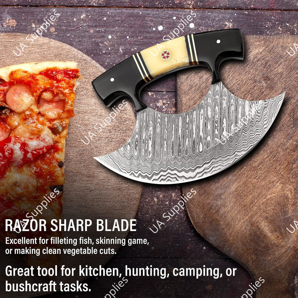 Couteau de chef Ulu professionnel en acier Damas forgé à la main, manche ambidextre, étui en cuir, lame extra-affûtée, personnalisable, pour la cuisine