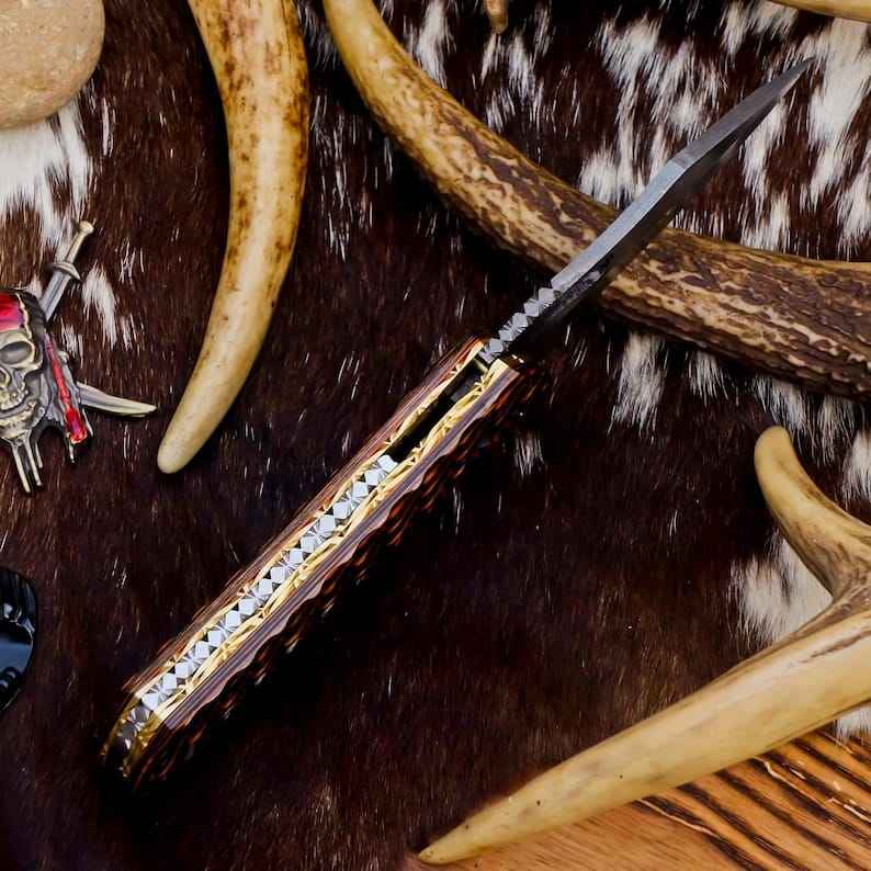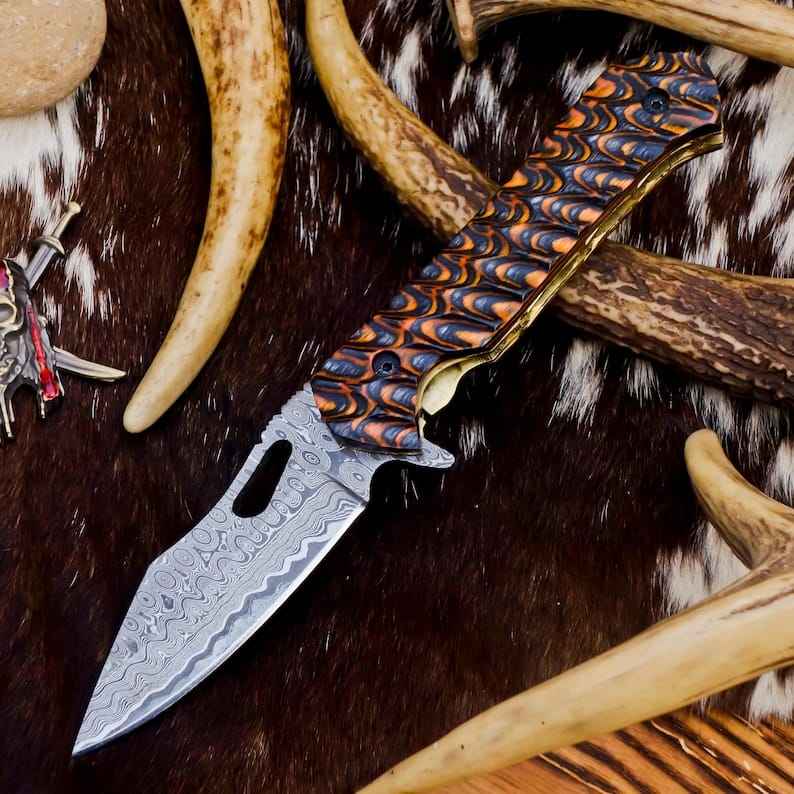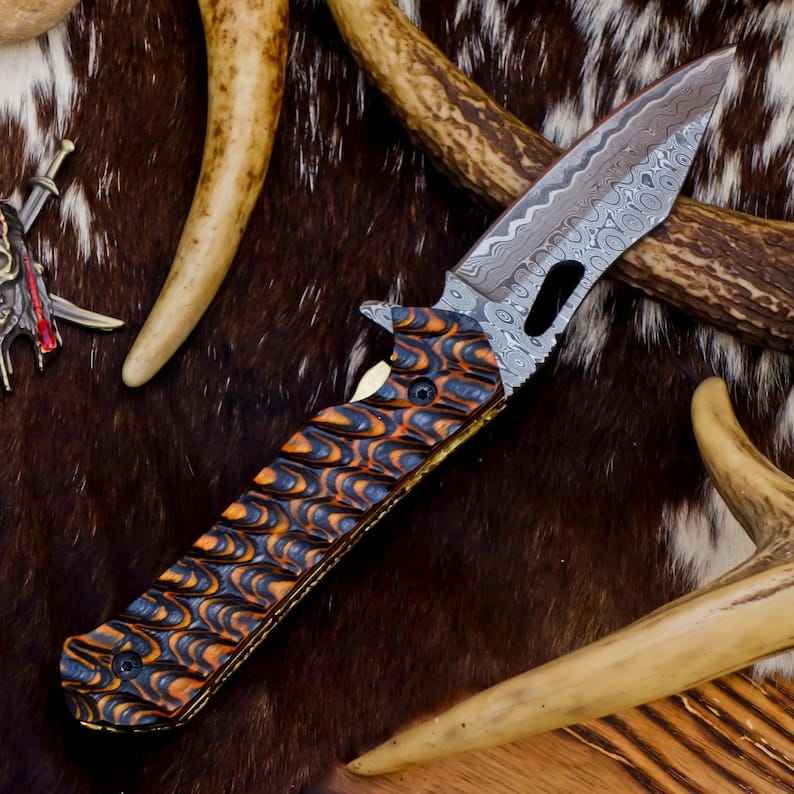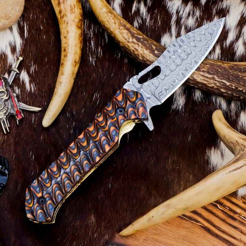 Couteau pliant artisanal professionnel en acier Damas, de qualité industrielle, pour le camping en extérieur, avec étui.