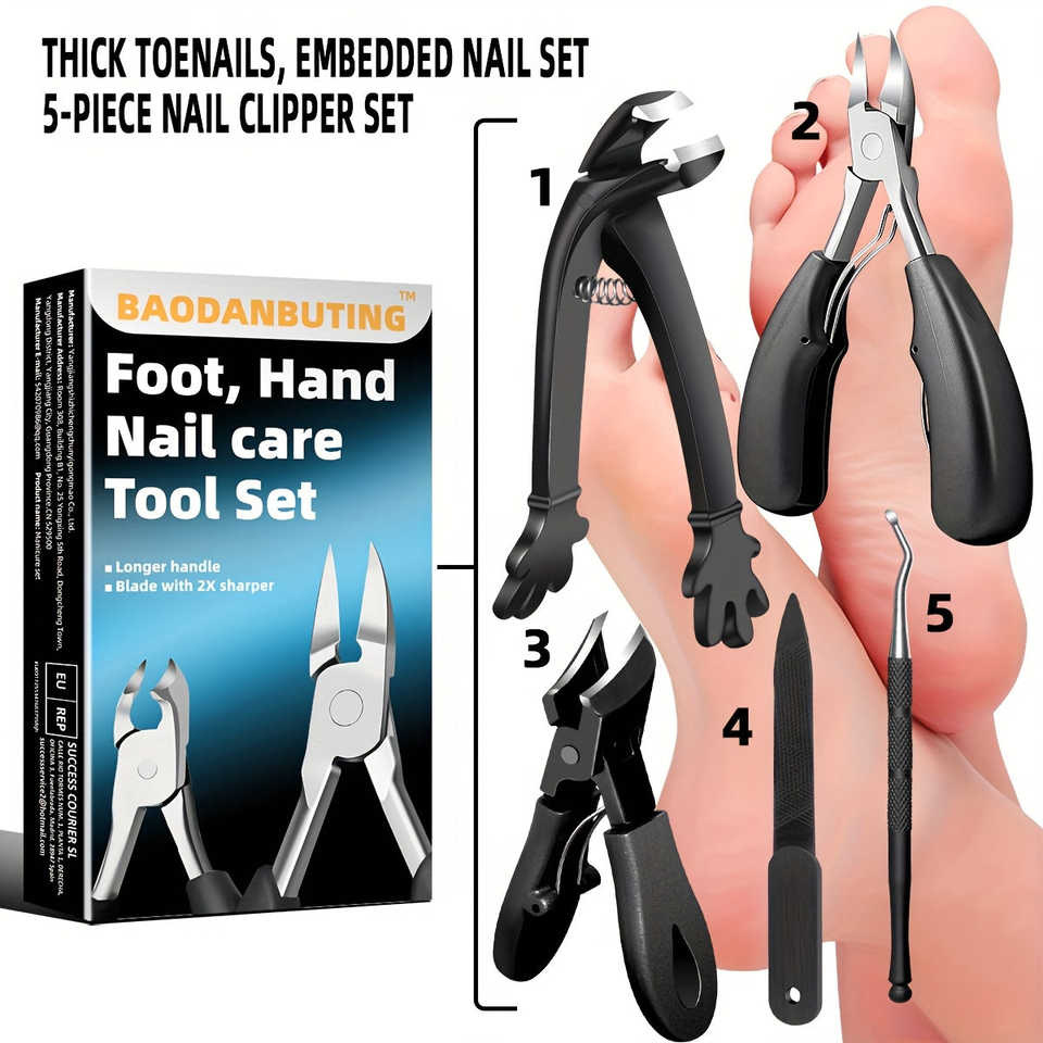 Professional Heavy-Duty 5pcs Toenail Clipper Set Ingrown Thick Toes Stainless Steel Concave Blade Curved Design Modern Style