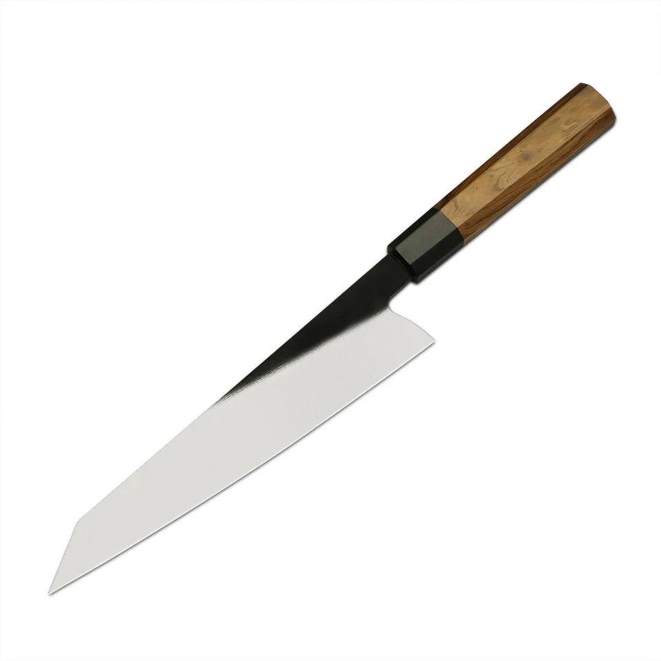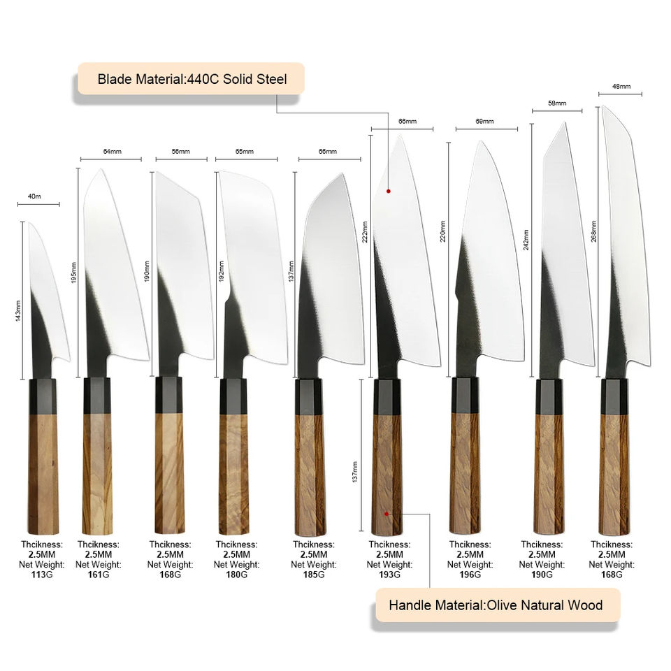 Ensemble de couteaux de cuisine professionnels avec lames en acier inoxydable, design ambidextre, lame enduite, finition noire, manche en bois d'olivier
