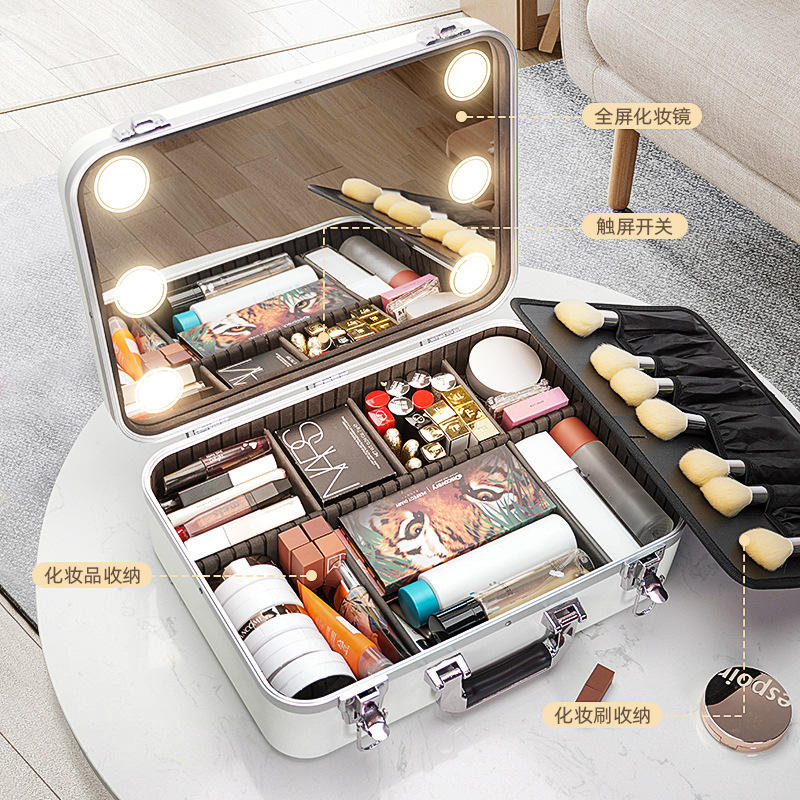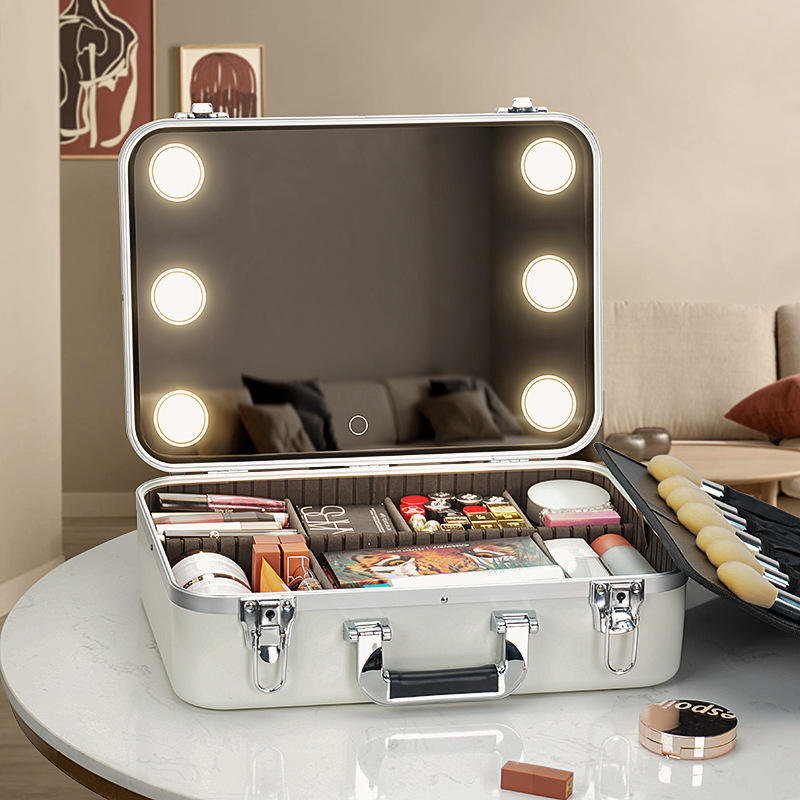 Trousse de Maquillage Professionnelle avec Miroir LED Lumineux, Cadre en Aluminium Portable, Rectangulaire Blanc, 6 LED, Matériau PC Haut de Gamme