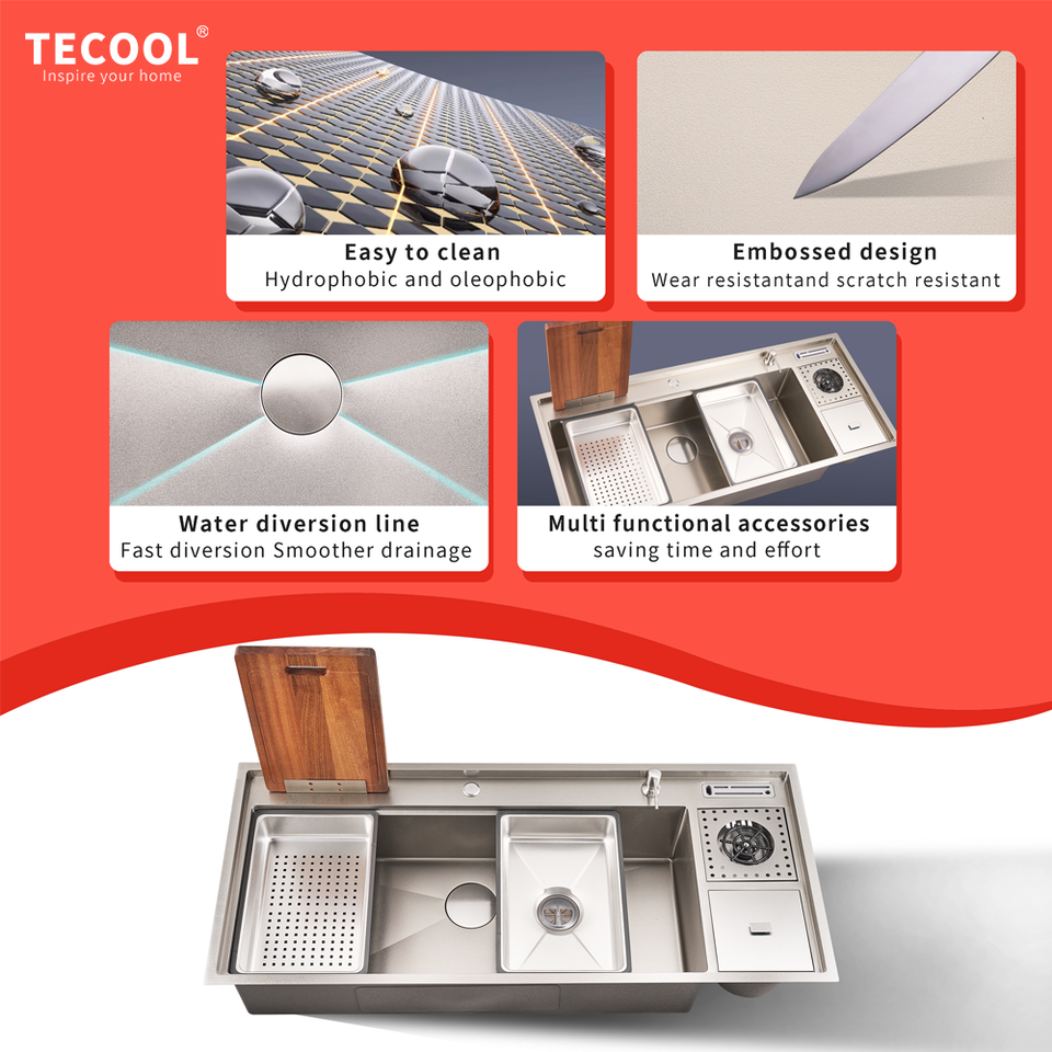 Évier de cuisine professionnel en acier inoxydable SS304, fait main, fonctionnel, à encastrer, grande cuve