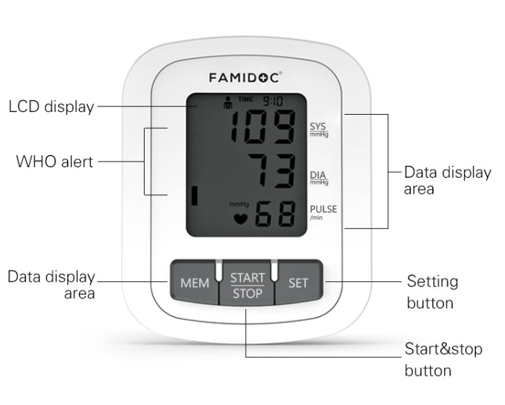 Mesure de la pression artérielle, Mesure de la fréquence cardiaque, Caractéristique voix, Domaine médical, Contrôles quotidiens, Lumière de fond sélectionnable, Haute précision, Accueil, Hôpital, Rechargeable, Soins de santé, Portable