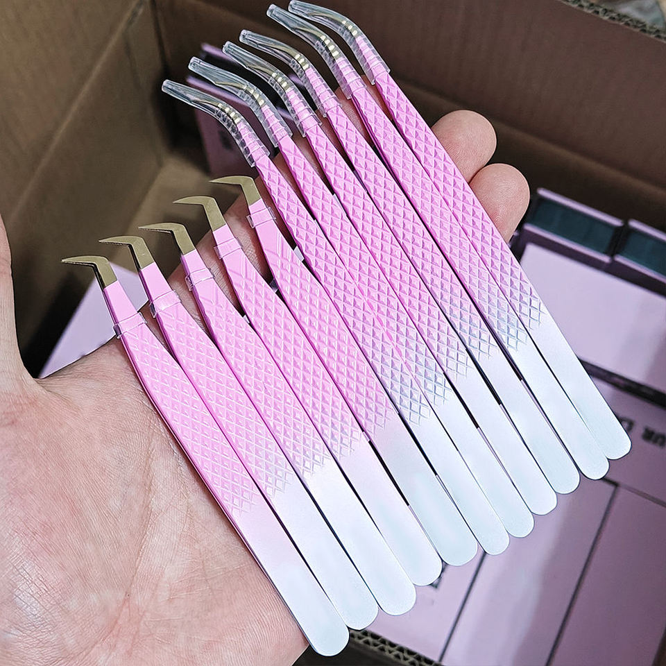 Pinces à cils professionnelles de précision à pointe en fibre, logo personnalisé, acier inoxydable, pinces à cils fines droites, volume, 45 90 degrés