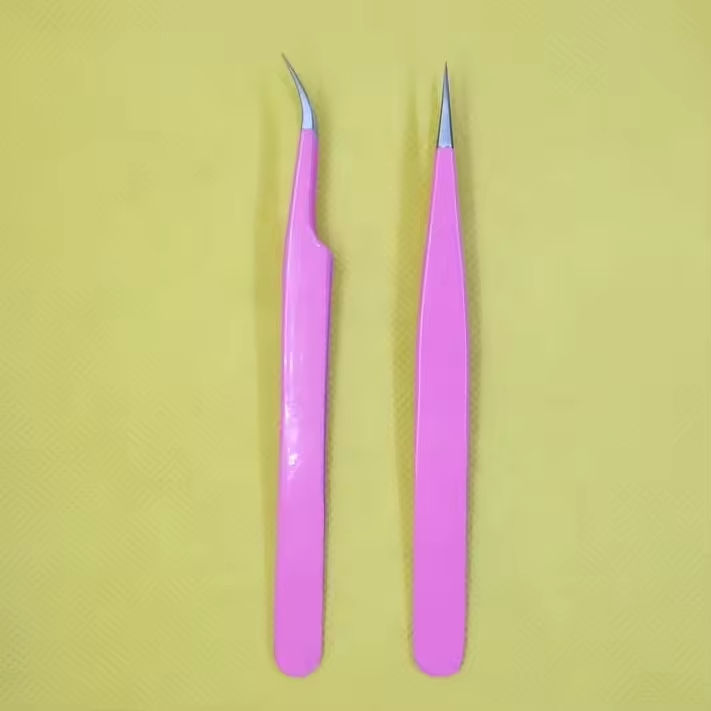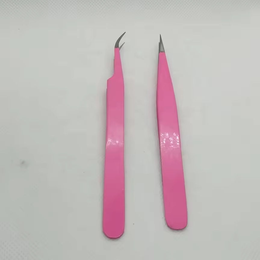 Ensemble de pinces à cils professionnelles de précision faites à la main, roses, en acier inoxydable, applicateur en fibre, courbées et droites, parfaite précision