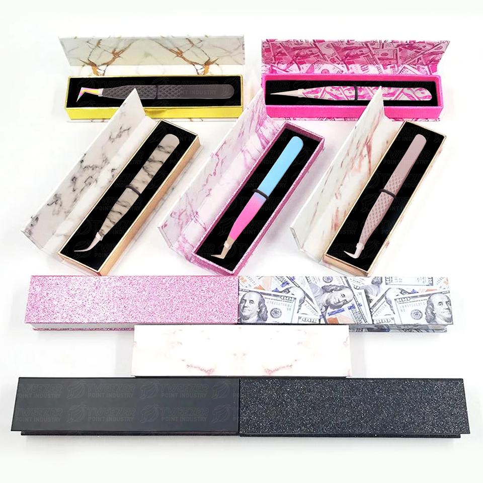 Pince à cils professionnelle en acier inoxydable de marque privée boîte à cartes emballage pince à épiler d'extension de faux cils avec pointe pointue