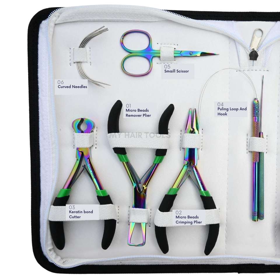 Kit d'outils professionnels pour extensions de cheveux arc-en-ciel : pince à clipser, coupe-bande, enfileur de boucles, crochet, pince à sertir, ciseaux de coupe