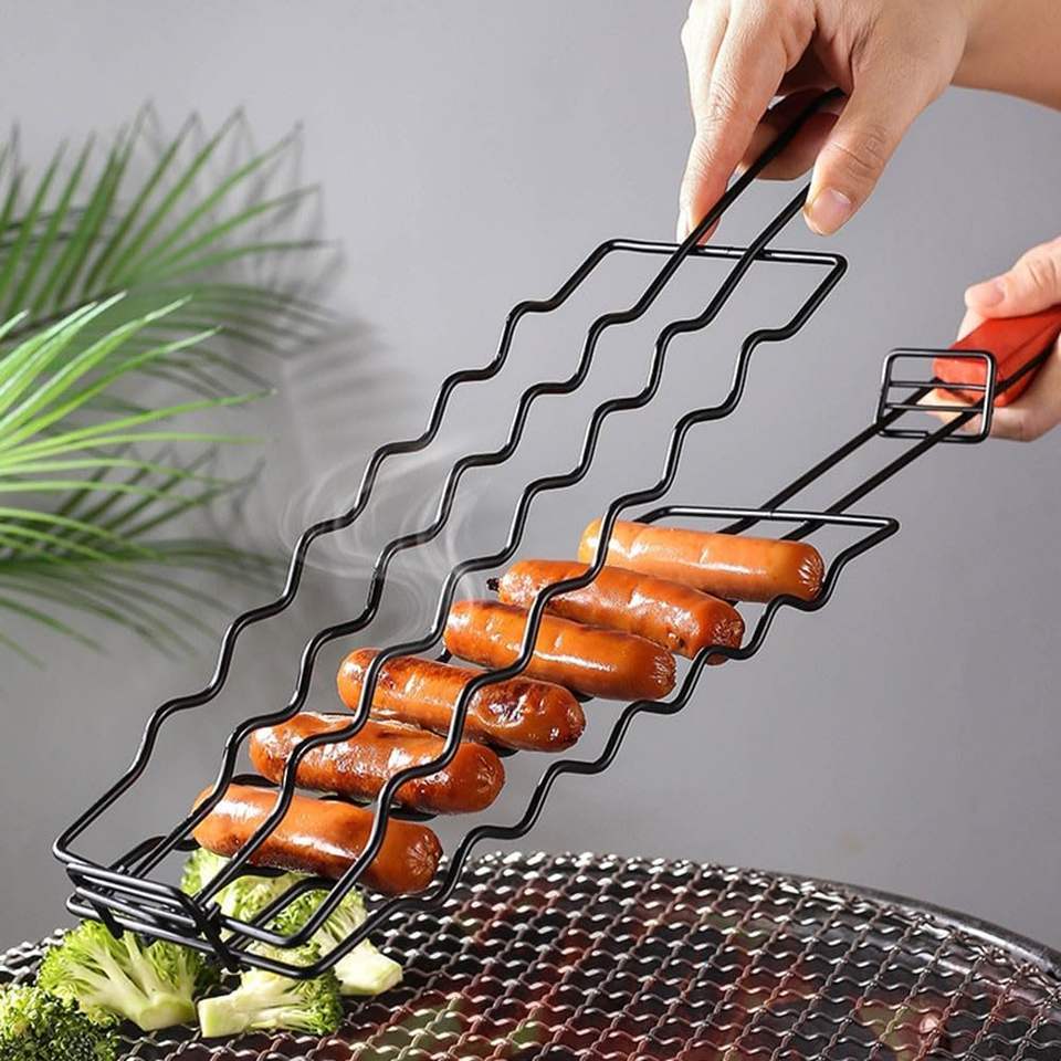 Support professionnel amovible pour hot-dogs avec poignée en bois résistante à la chaleur, panier de barbecue en acier inoxydable, pince en maille pour grillades