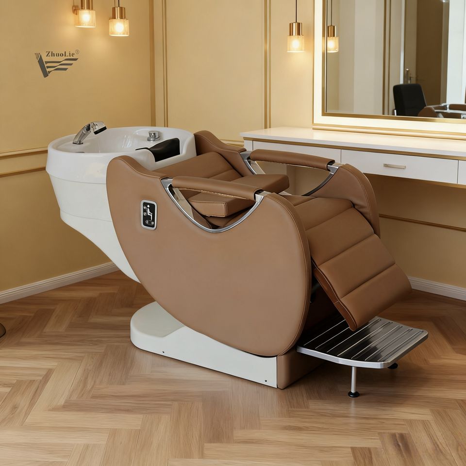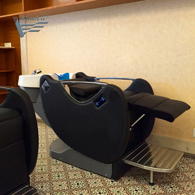 Chaise de shampooing professionnelle pour salon de coiffure et spa avec lavabo en céramique électrique, dossier et repose-pieds réglables, design moderne