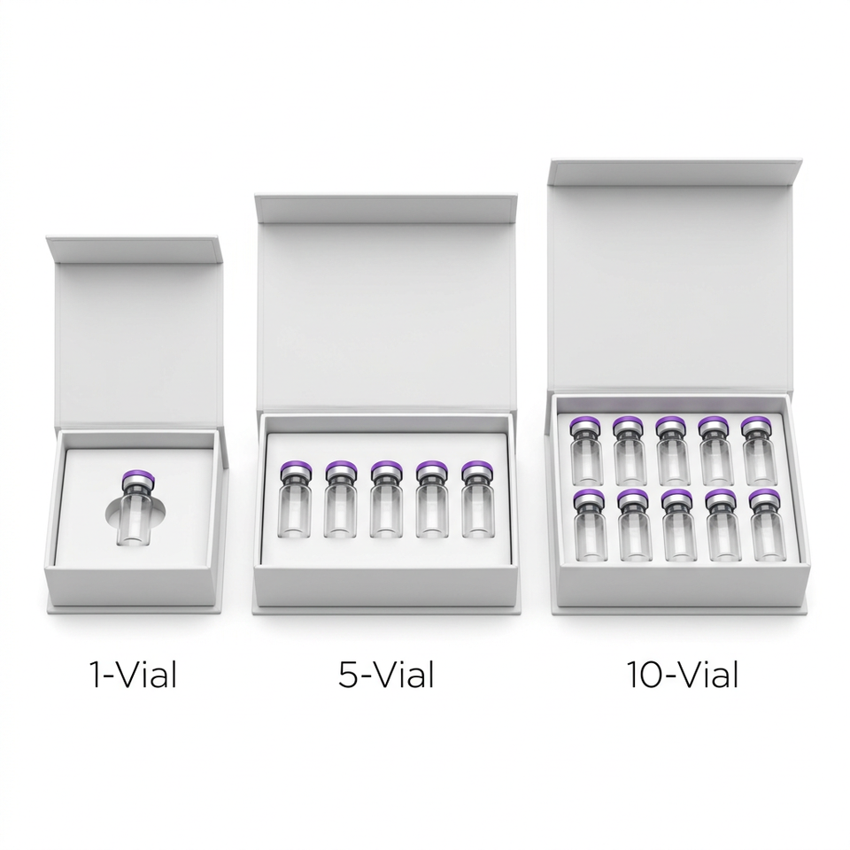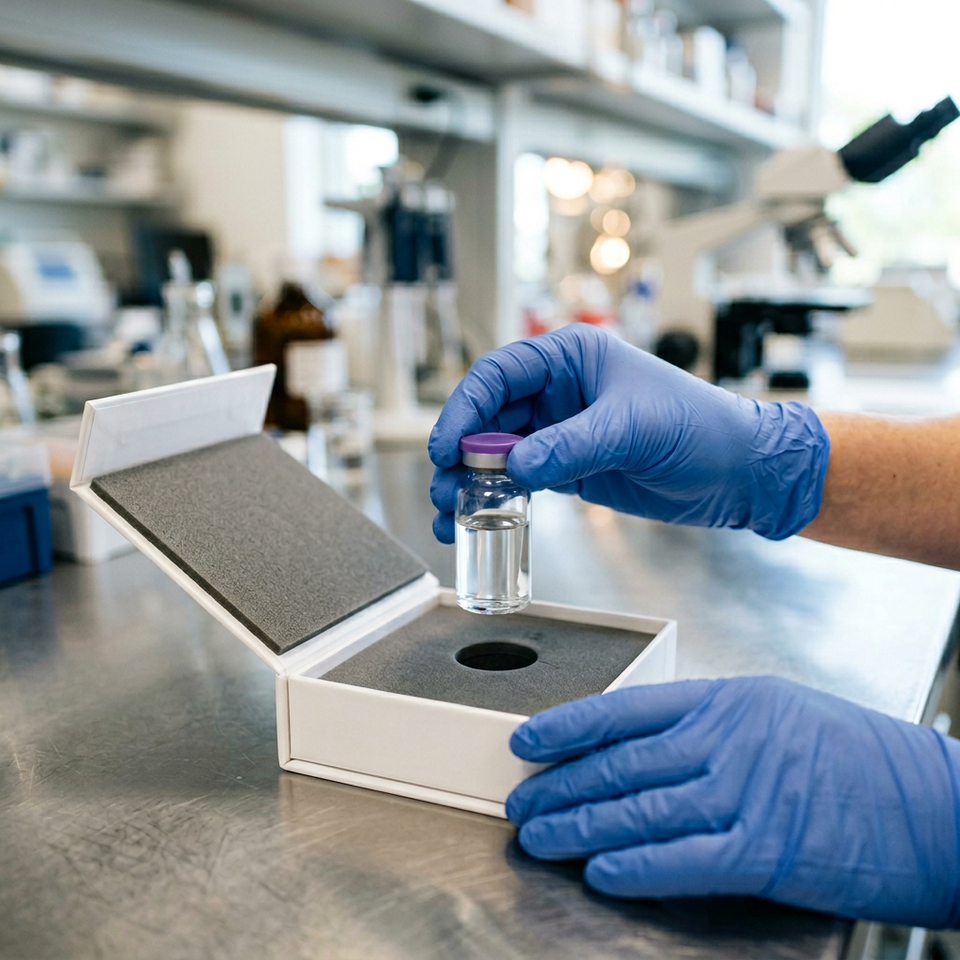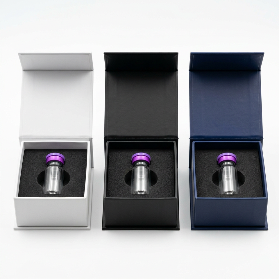 Boîte d'emballage magnétique rigide professionnelle pour flacon unique, idéale pour l'échantillonnage et le stockage de peptides de haute valeur en recherche.