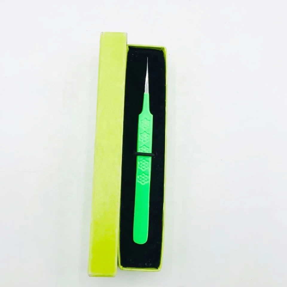 Pince à épiler professionnelle en acier inoxydable massif pour cils, avec étiquette personnalisée, couleur verte, à angle droit