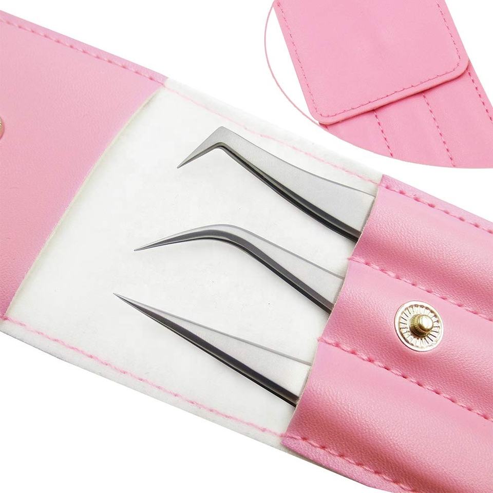 Ensemble professionnel de pinces à cils en acier inoxydable 3 pièces, droites, courbées et en forme de L, pointes 3D avec étui en cuir
