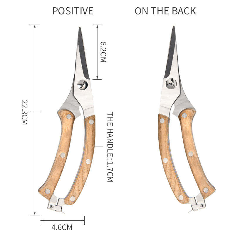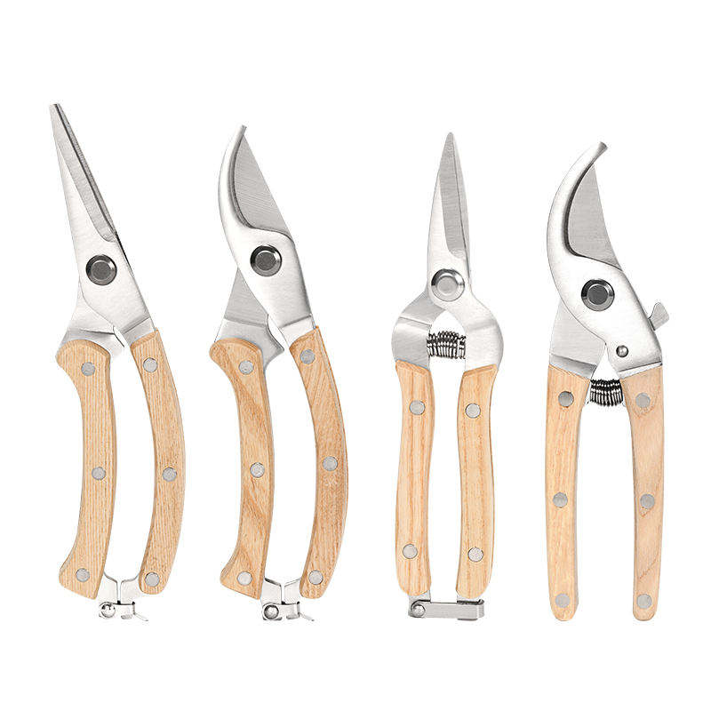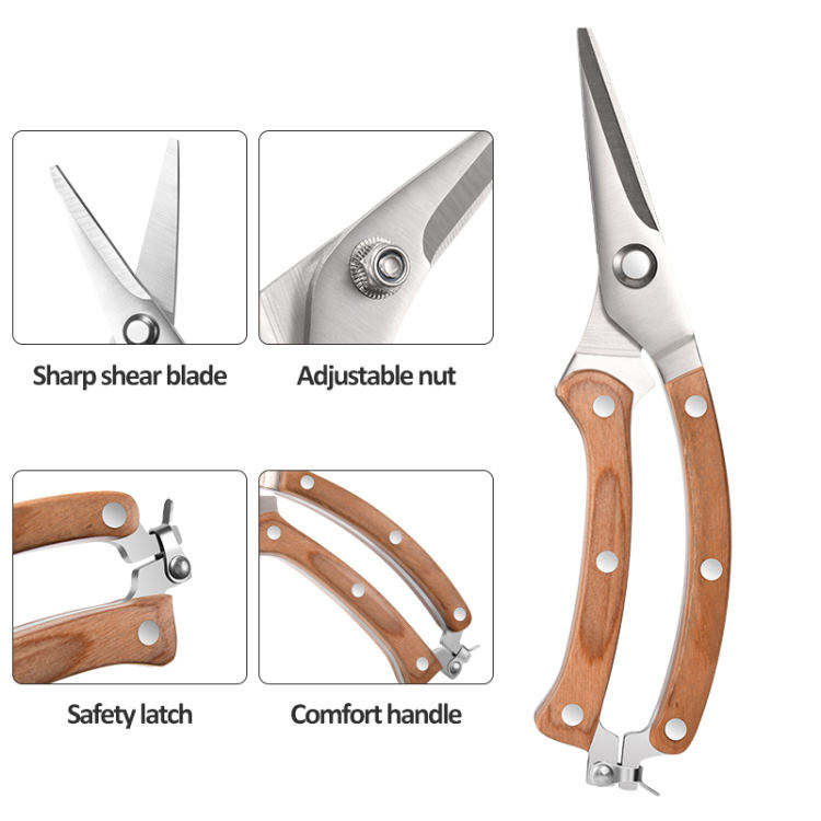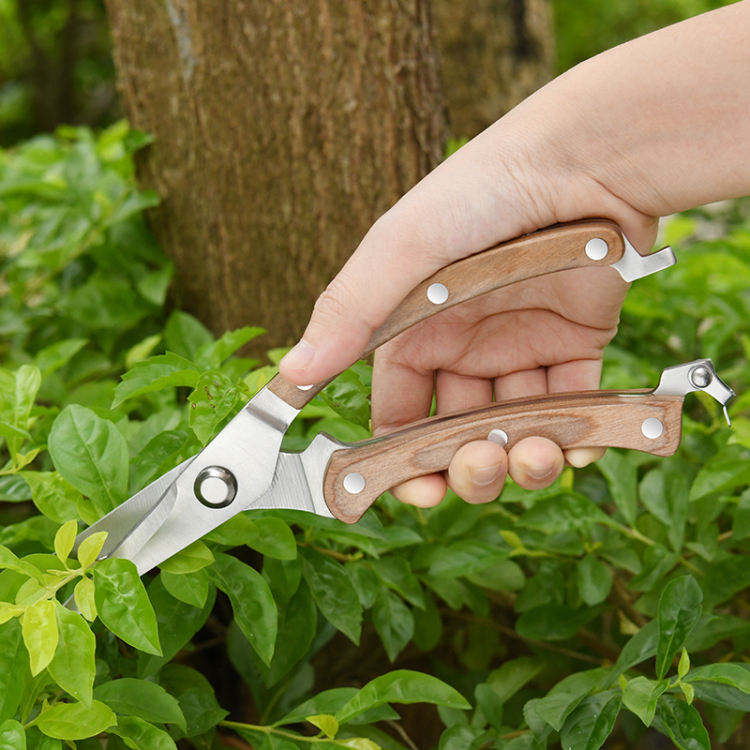 Sécateur de jardin professionnel en acier inoxydable avec manche en bois, lame tranchante, écrou réglable et verrou de sécurité pour la taille des arbustes