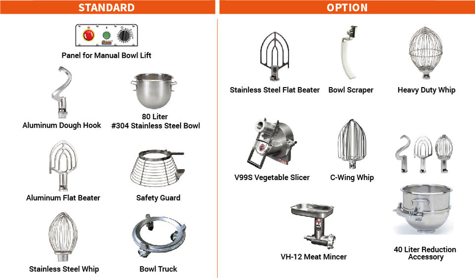 Standard Accessory:1 BOWL, 1 DOUGH HOOK, 1 BEATER AND 1 WHIP