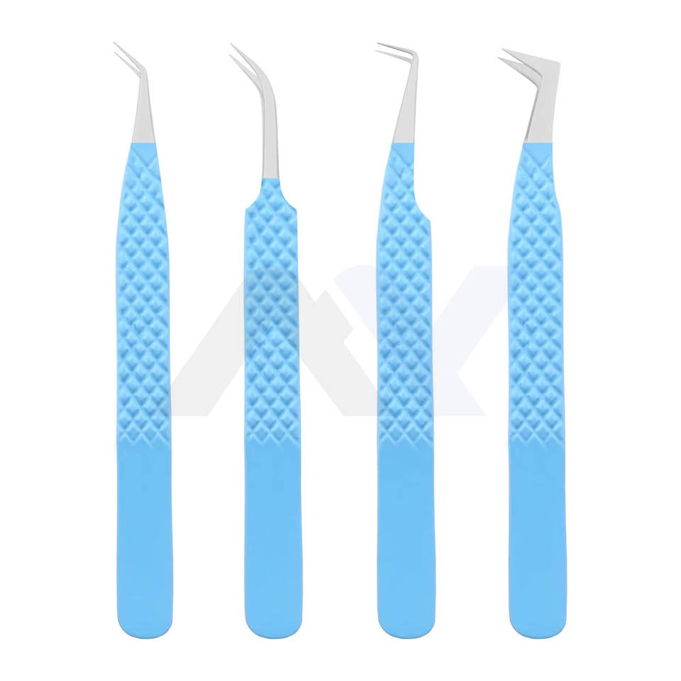 Pinces professionnelles couleur turquoise pour extensions de cils, avec grip diamant, en acier inoxydable, pointe en fibre, lot de 4 pièces