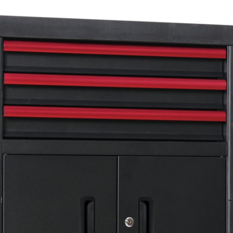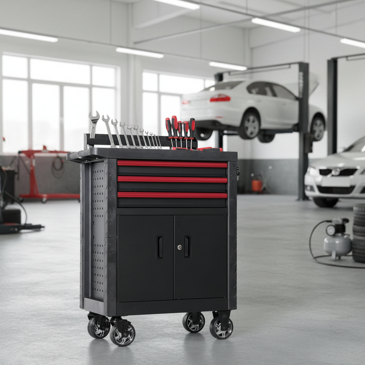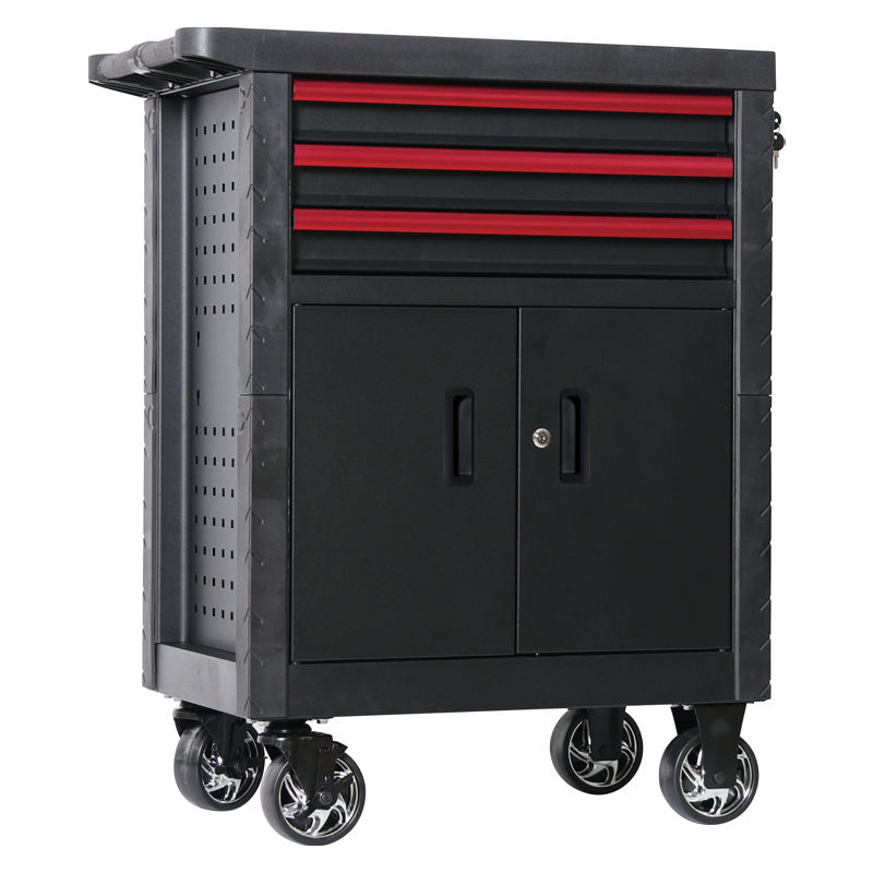 Chariot d'atelier professionnel avec porte latérale et rangement, 3 tiroirs, organisation optimisée, acier thermolaqué, solution personnalisée OBM/OEM pour atelier