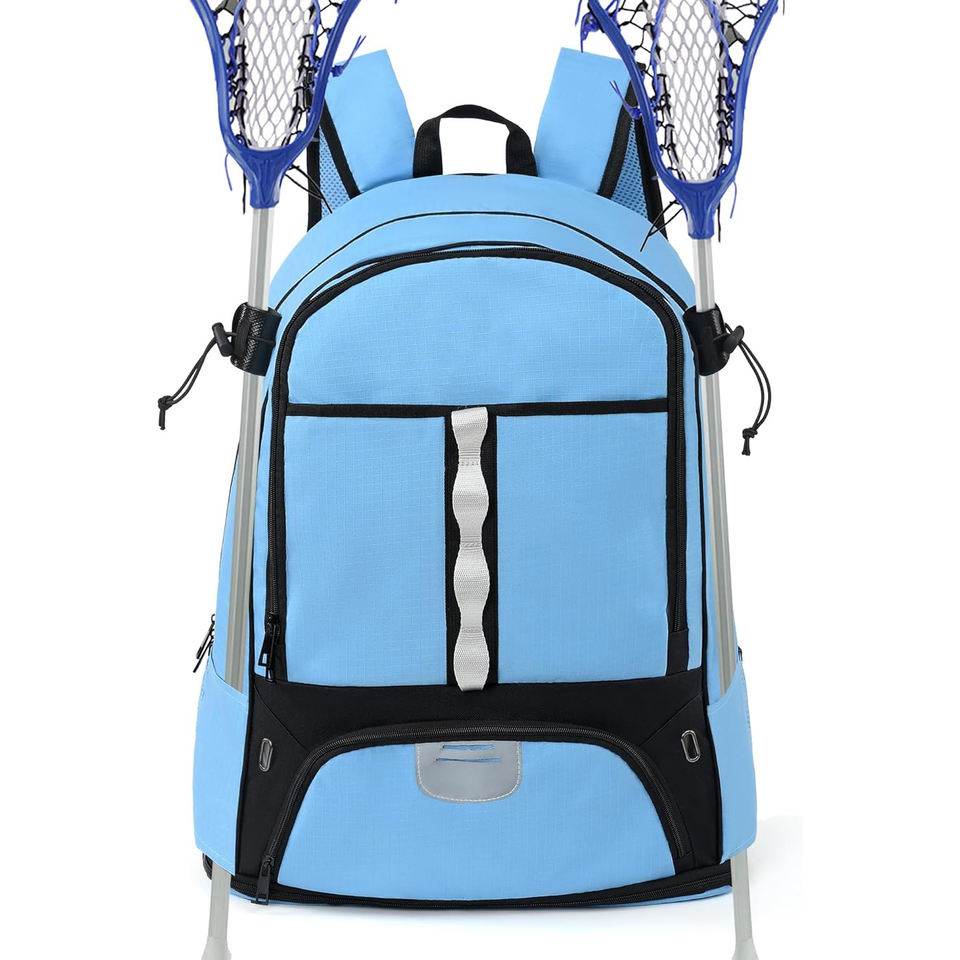 Sac à dos de lacrosse professionnel bicolore gris avec bandes réfléchissantes de sécurité, compartiment séparé pour chaussures et design à panneaux avec fermeture éclair