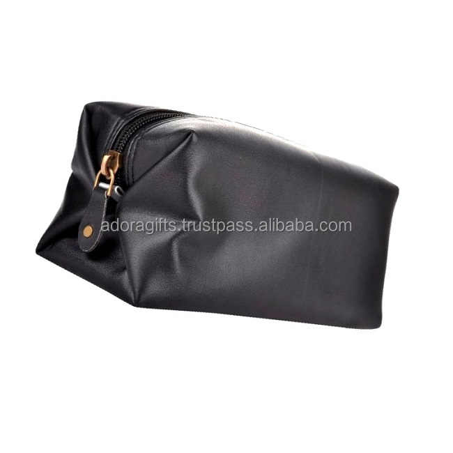 Trousse de maquillage de luxe professionnelle en cuir véritable noir uni avec fermeture à glissière et logo personnalisé pour cosmétiques