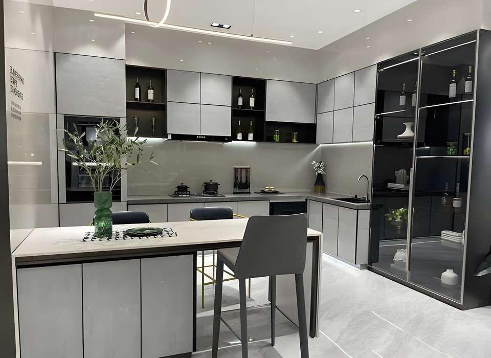 Projet automatique le plus récent moderne gris laque préfabriqué Base supérieure vitrine de cuisine meubles de cuisine