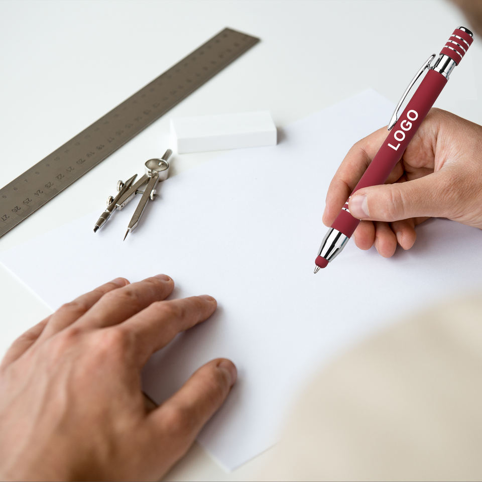 Promotion : Stylo à bille 2-en-1 avec pointe tactile capacitive, corps métallique et embout en caoutchouc souple, personnalisable avec logo, idéal pour les cadeaux d'affaires