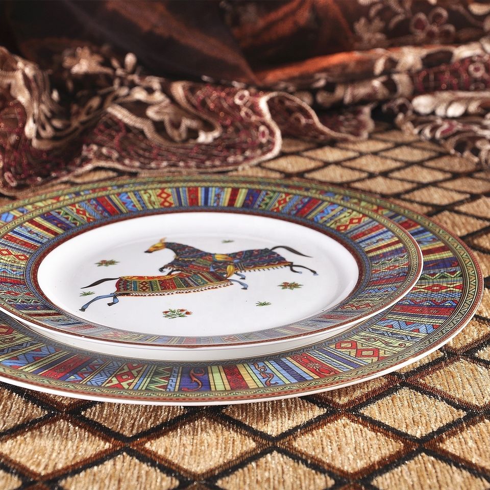 Promotionnel 4 pièces pouces Europe occidentale palais luxe cheval de guerre ensembles de salle à manger os porcelaine plats et assiettes