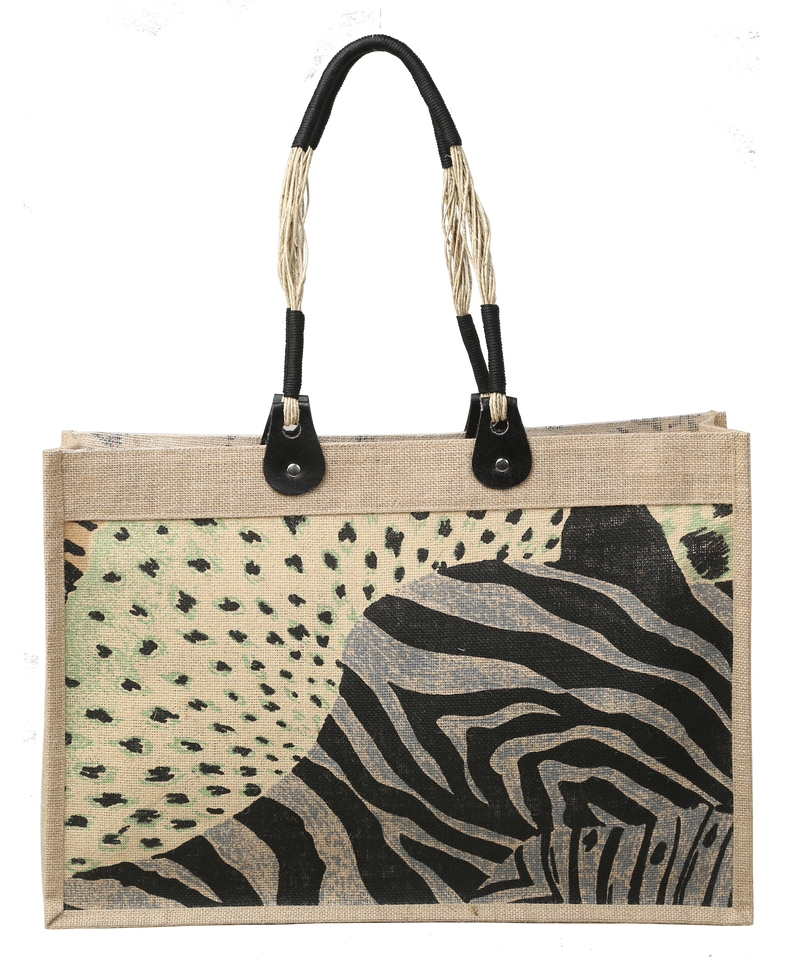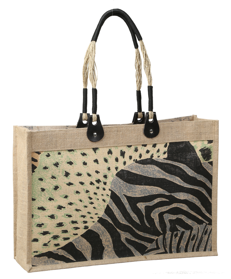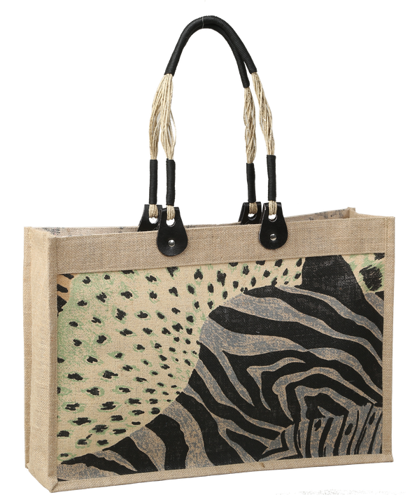 Sac promotionnel à longue poignée en jute imprimé animalier avec poignée en cuir fantaisie et corde, fabriqué au Bengale occidental en Inde