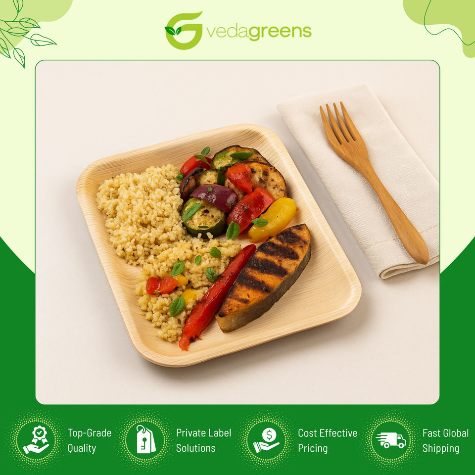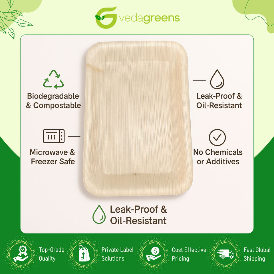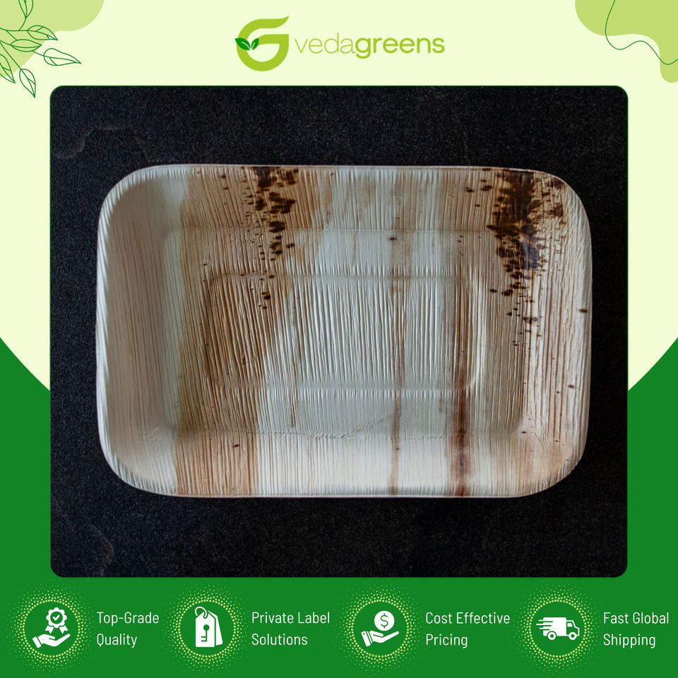 Assiettes rectangulaires jetables en fibre de palmier Areca, qualité éprouvée, best-seller, idéales pour servir les repas, provenant d'un vendeur indien.