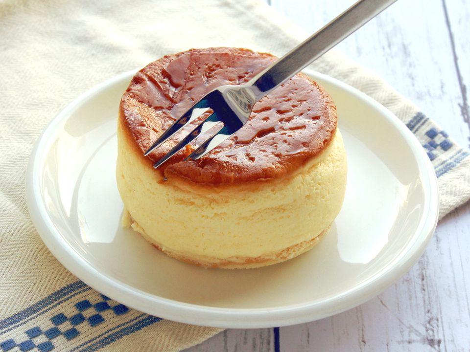 Soufflé au fromage japonais de style pudding, doux comme du coton, avec crème anglaise et caramel, portion individuelle