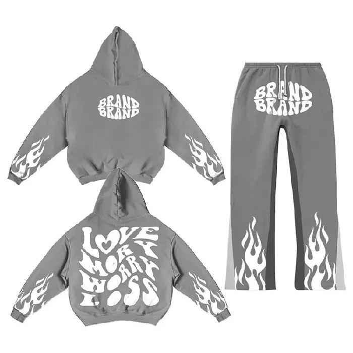 Ensemble survêtement et sweat à capuche pour homme, imprimé en relief, logo personnalisé, coupe évasée, 100% coton, ourlet brut, pantalon de survêtement évasé
