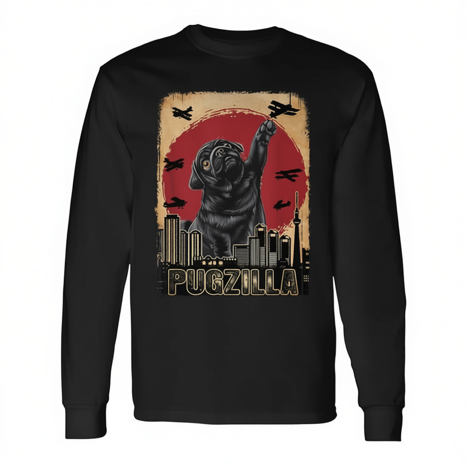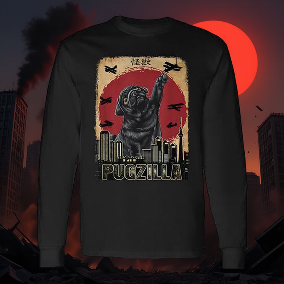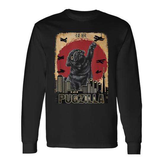 Pugzilla T-shirt noir à manches longues avec motif Kaiju japonais