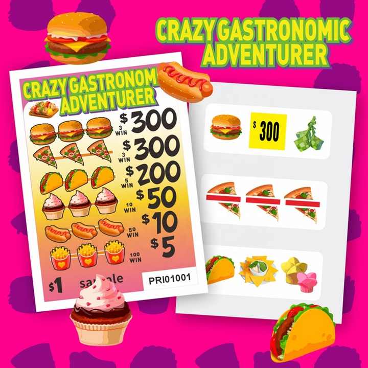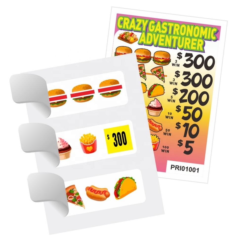 Billets à déchirer à languette, design ludique alimentaire, carte à 3 fenêtres, papier couché personnalisé, motifs, taux de gain, impression numérique