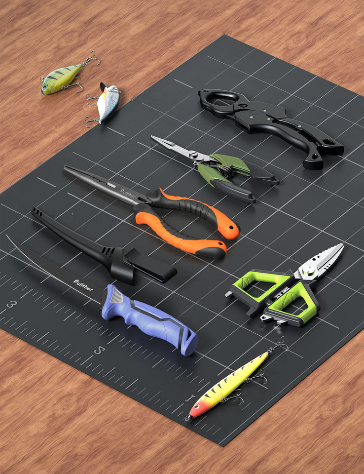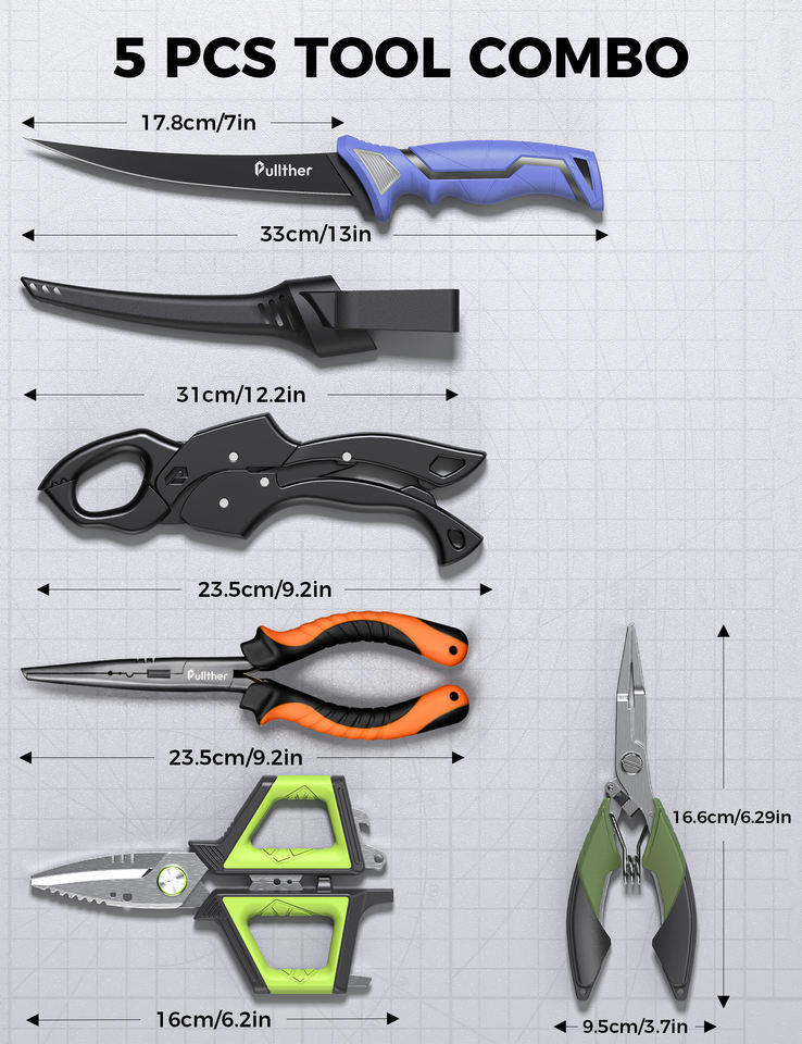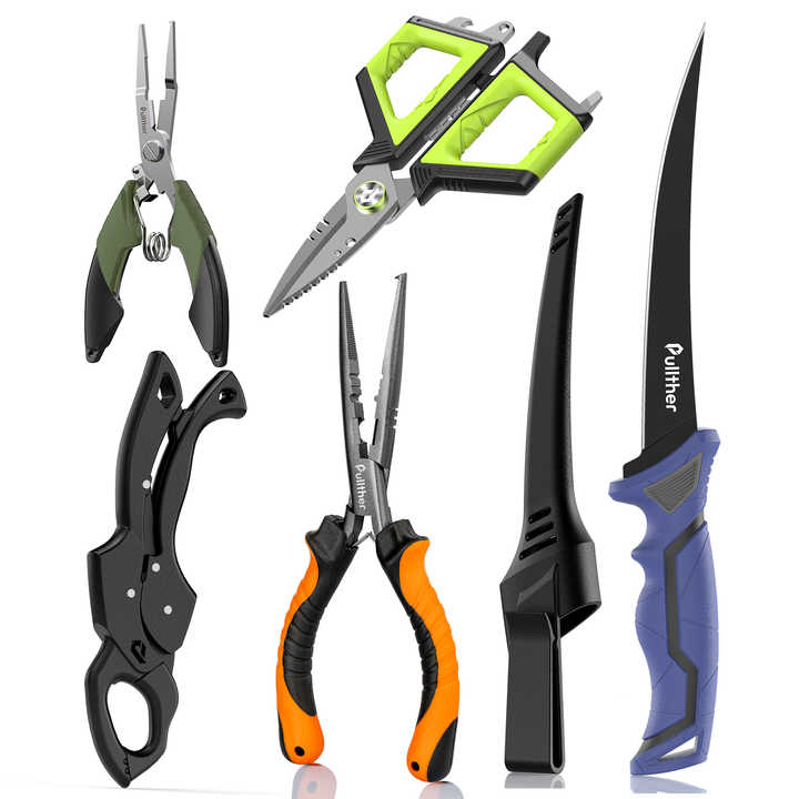 Pullther 6pc Kit d'outils de pêche Pince de pêche Couteau à filet, pince à lèvres de poisson flottante, ciseaux de pêche Cadeaux de pêche pour hommes