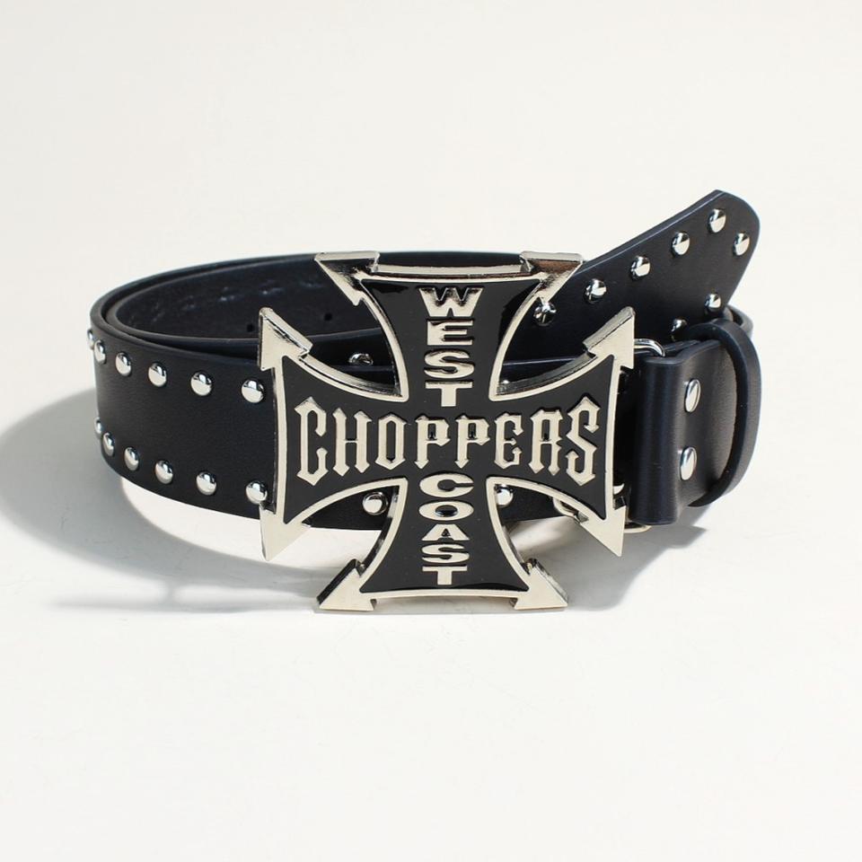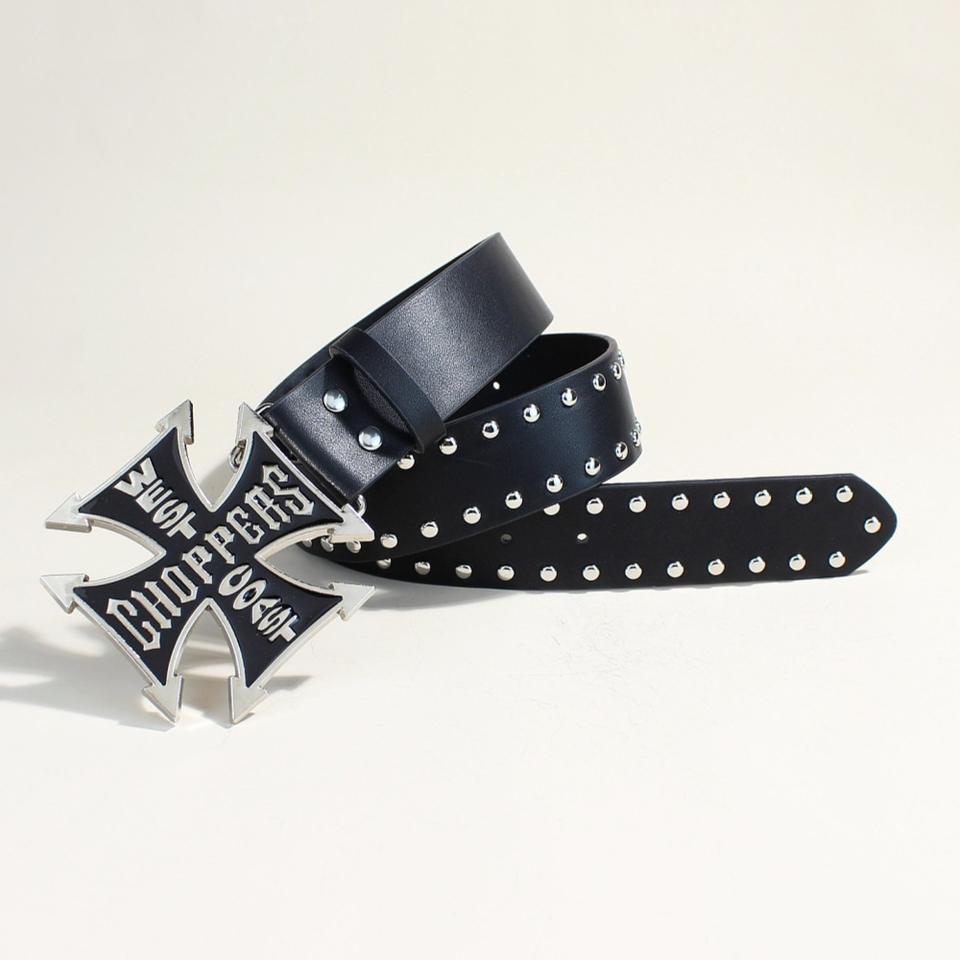 Ceinture en cuir PU à rivets punk pour femmes et hommes, style vintage West Coast Choppers, boucle en métal croix de fer, ceinture gothique rock streetwear