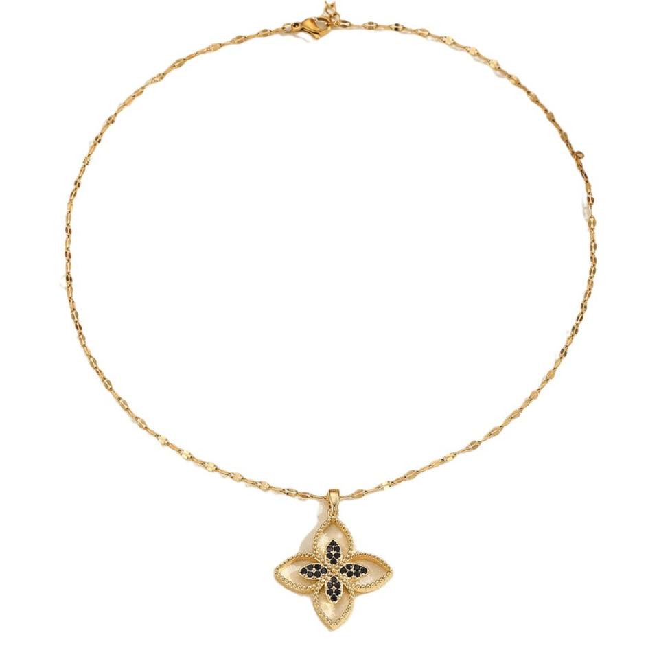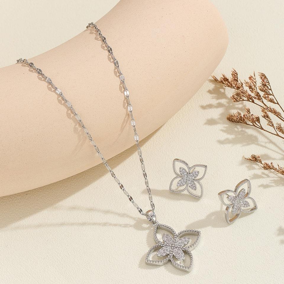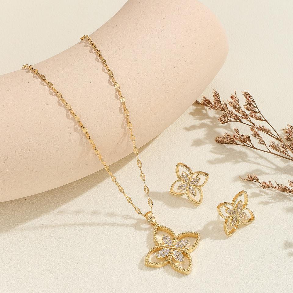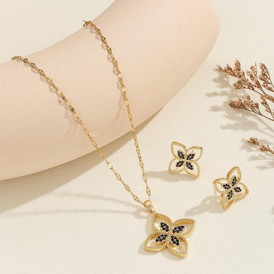 Ensemble de 2 pièces de bijoux punk : boucles d'oreilles et collier en cuivre et zircon, style trèfle à quatre feuilles, cadeau de mariage pour femme, chaîne assortie, ne se décolore pas