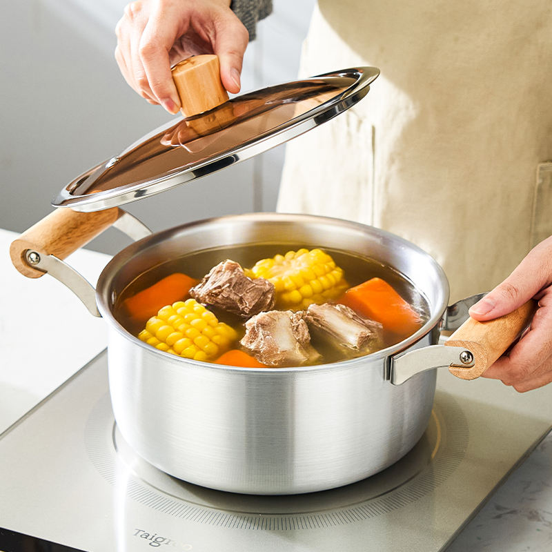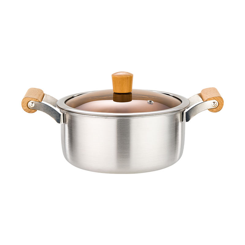 Marmite en aluminium pur avec deux poignées en bois, couvercle en verre, compatible gaz et induction, design moderne, conduction de chaleur rapide