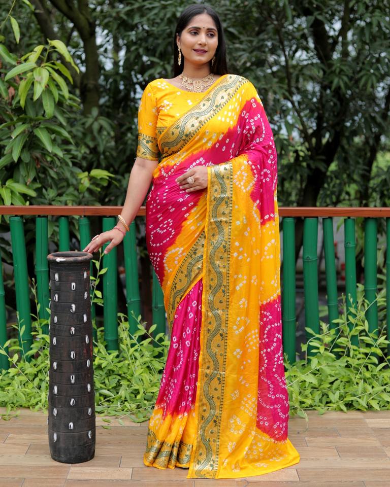 Pure Beautiful Design Léger Bandhej Sari en soie douce avec grande bordure large pour les femmes Collection de vêtements indiens et pakistanais