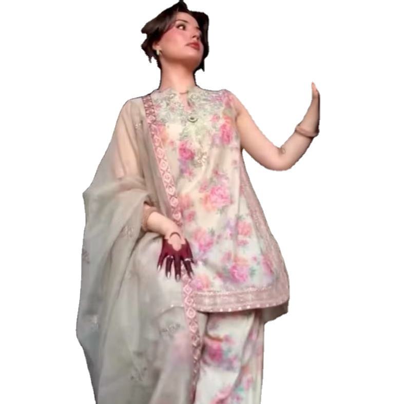 Tissu en mousseline de soie pure fantaisie imprimé fleuri bébé rose couleur fil et broderie travail coupe droite Salwar Kameez avec ensemble Dupatta