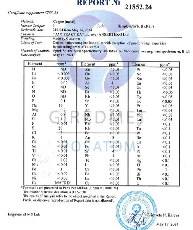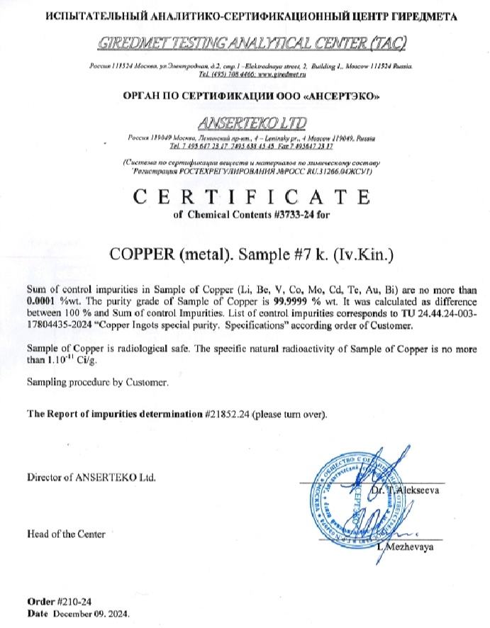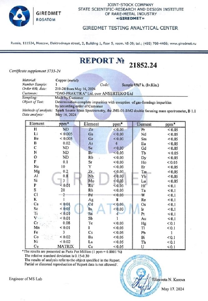 Cuivre Pur de Grade 5-6 N Haute Pureté (.999999) pour l'Industrie des Semi-conducteurs avec Service de Soudage