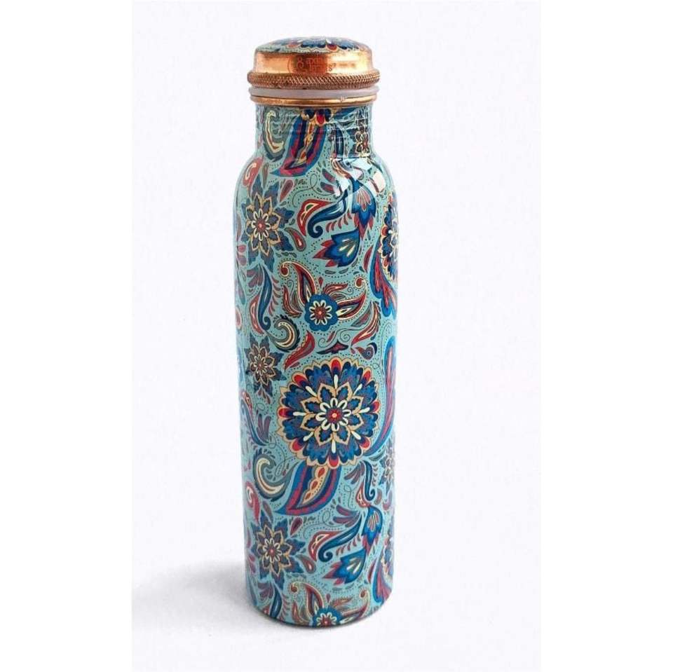 Bouteille d'eau en cuivre pur, revêtement laqué, anti-fuite, bienfaits ayurvédiques, récipient en cuivre artisanal, imprimé floral, flacon de yoga