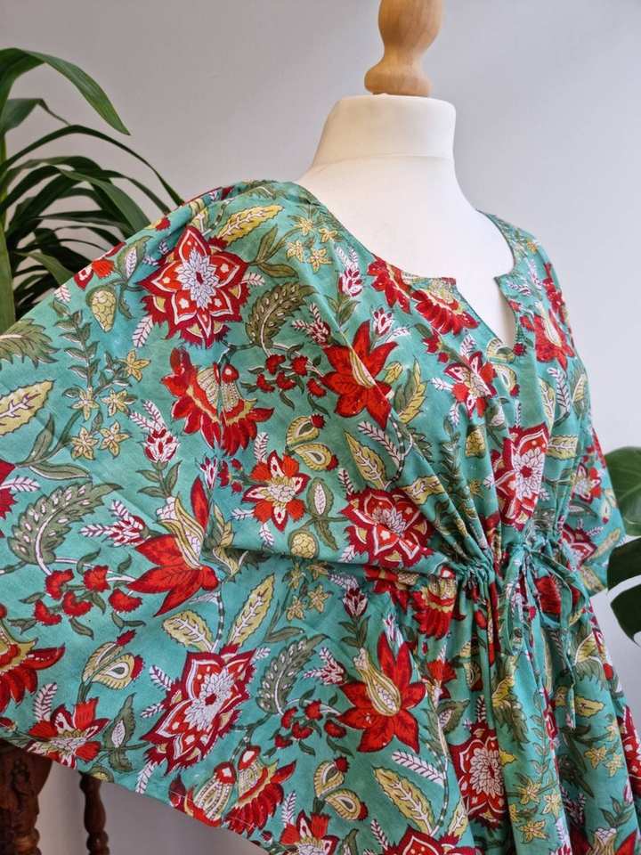 Pure Cotton Kaftan Indian Block Printed Summer Kimono Floral Beach Coverup Comfy Maternity Spring Aqua Green Red