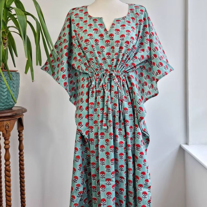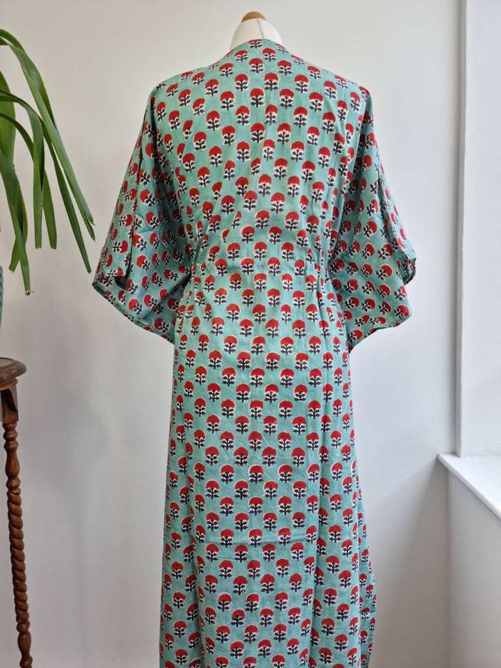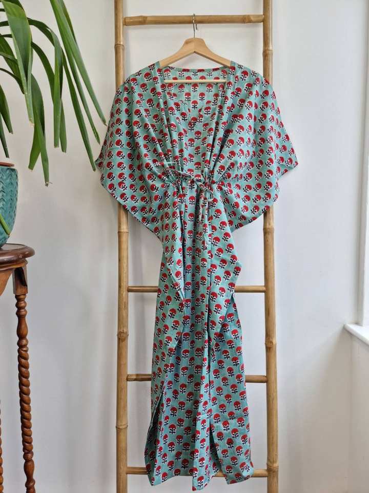 Pure Cotton Kaftan Long Dress Indian Blockprint Summer Kimono Floral Beach Coverup Comfy Maternity Slated Aqua Green